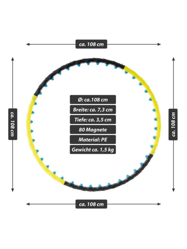 Pevne zabudované masážne vsuvky obruče a 48 magnetov, ktoré obsahuje, slúžia predovšetkým nielen na masáž, ale podporujú aj samoliečbu a proces chudnutia. Optimálna obruč siaha od podlahy približne k pupku. Obruč je možné vziať a používať prakticky kdekoľvek, jednotlivé segmenty je možné zostaviť behom chvíľky.