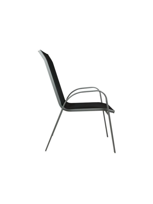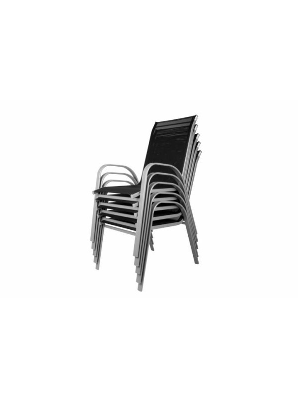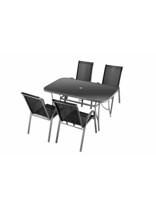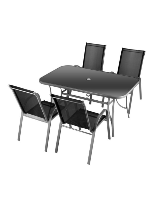 Tento luxusný záhradný nábytok je ideálny do záhrady alebo na terasu. Táto kompletná sada pre štyri osoby sa skladá zo stolu a štyroch stoličiek. Rám je vyrobený z lakovanej ocele. Pre maximálne pohodlie je stolička vybavená opierkami po ľavej a pravej strane. Pre ušetrenie miesta je možné stoličky naskladať na seba. Použité materaiály sú bezúdržbové, odolné voči poveternostným vplyvom a nevyžadujú špeciálnu starostlivosť.