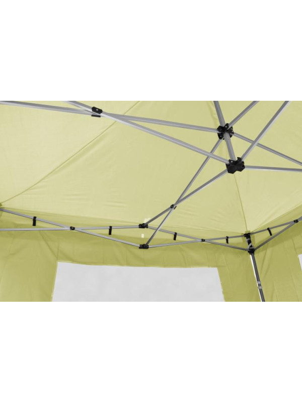 Tento záhradný stan je vhodný na záhradné oslavy, pohodlné posedenie, môžete ho využiť na firemný večierok aj na stánkový predaj. Nožnicová konštrukcia Vám zaručí jednoduché zloženie aj rozloženie stanu - stačí iba konštrukciu roztiahnuť. Záhradný stan Vás ochráni pred priamym slnečným žiarením, nepríjemným dažďom alebo iným nepriaznivým počasím. Stan je kompletne uzavretý pomocou štyroch bočných stien s oknami. Bočné steny sú k nohám pripevnené pomocou suchých zipsov a k hornej hrane konštrukcie pomocou háčikov. Nohy stanu sú teleskopicky polohovateľné a majú plastové pätky pre ukotvenie do zeme.