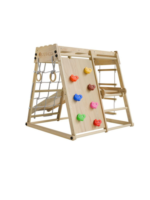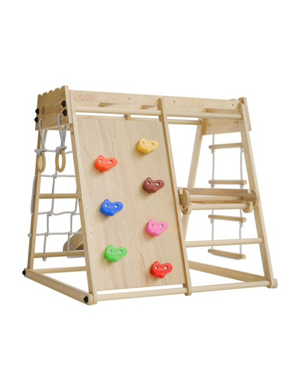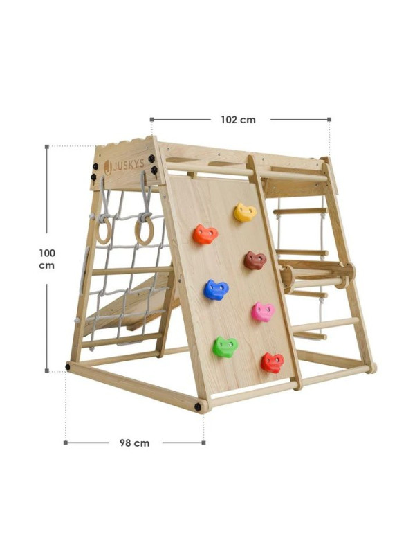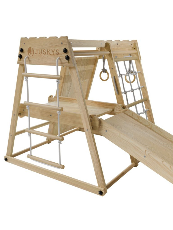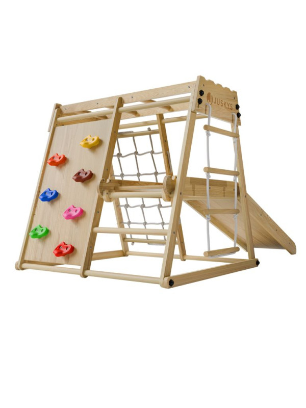 Každá detská izba sa môže premeniť na malé domáce ihrisko, kde nie je núdza o pohyb ani fantáziu. Táto drevená preliezačka ponúka deťom veľa možností, ako sa zabaviť - môžu schádzať po šmykľavke, šplhať po lanovej sieti alebo rebríku, hojdať sa na kruhoch a skúšať nové zručnosti. Zábava je tu zároveň prirodzeným spôsobom rozvoja rovnováhy, sily aj obratnosti.