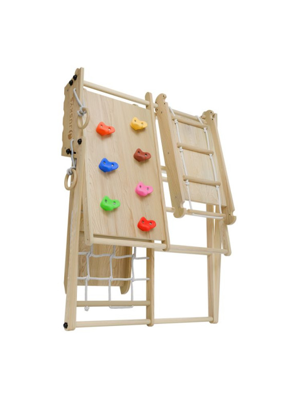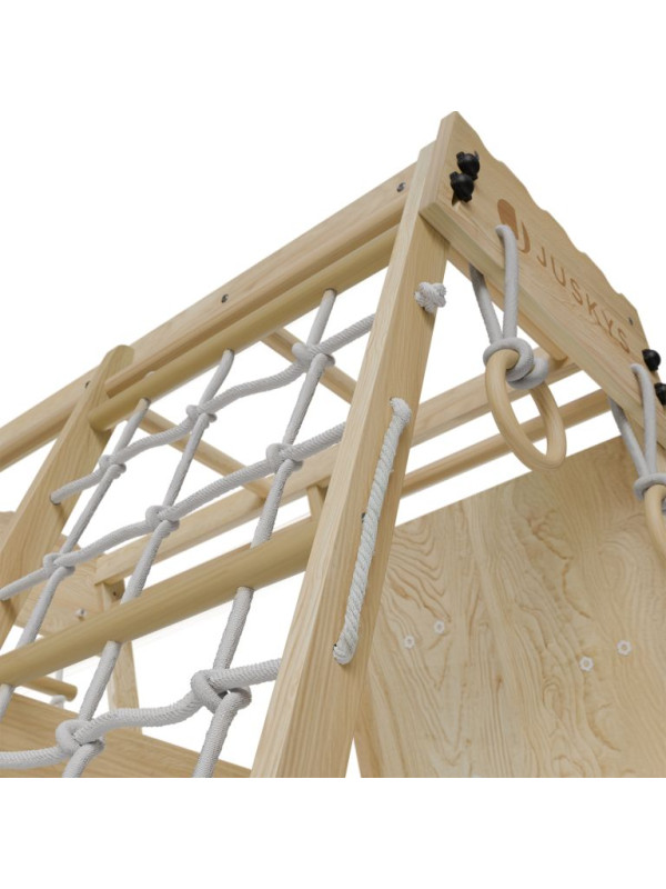 Celá konštrukcia je z kvalitného borovicového dreva a odolá každodennému šanteniu až troch detí naraz. Praktický skladací systém umožní preliezačku rýchlo zložiť a uvoľniť miesto, keď práve nie je v prevádzke. Vďaka kombinácii prírodného vzhľadu a farebných detailov sa navyše stane ozdobou každej detskej izby.