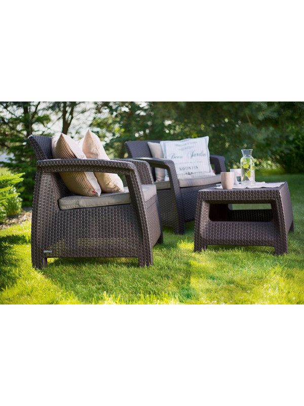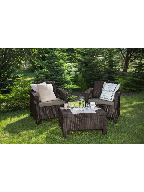 Súprava Corfu WEEKEND je menším moderným posedením do záhrady, interiéru alebo na terasu. Súprava je vyrobená z lisovaného plastu v imitácii plochého ratanu. Set je doplnený o podušky, ktoré zaistia ešte väčšie pohodlie. Jedná sa o veľmi obľúbenú súpravu. Skladá sa z dvoch kresielok a stolíka. Jednoduchá montáž aj údržba. Podušky sú súčasťou súpravy. Výrobca: Allibert.