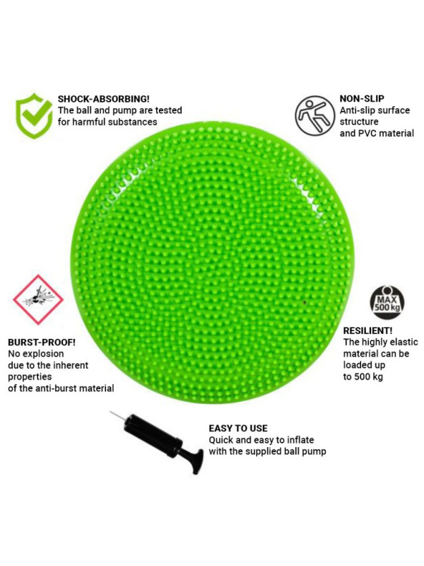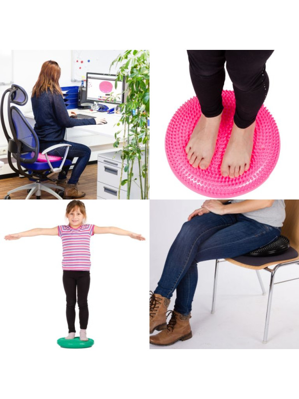 Podpora pre: zdravé polohy v sede, optimálny tréning chrbtových svalov neustálou zmenou polohy sedu, cvičebné zariadenie pre rovnováhu a pre posilňovacie cvičenia.