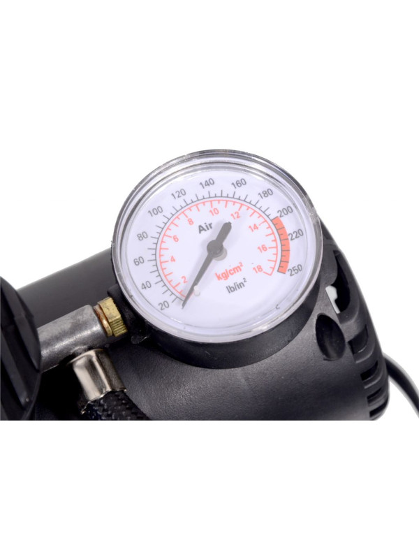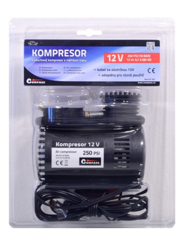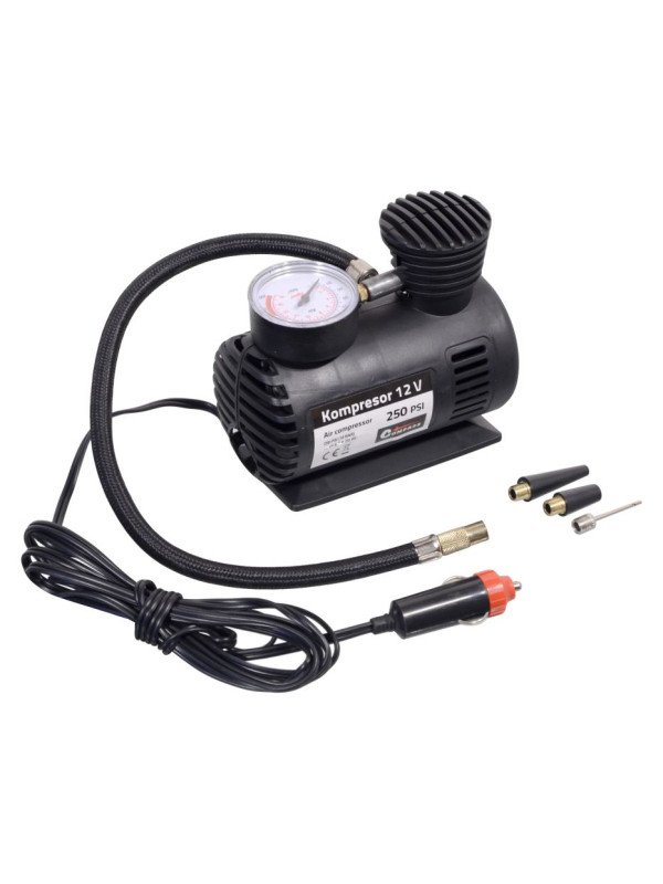 Vzduchový kompresor vybavený meračom tlaku s celokovovým adaptérom pre klasický autoventil. Napájanie 12 V, kábel so zástrčkou do zásuvky automobilového zapaľovača. Súčasťou balenia sú prídavné adaptéry na hustenie gumových matracov, lôpt a pod. Vďaka prídavným adaptérom je možné kompresor použiť aj na voľný čas, dovolenku atď. Umožňuje hustenie lôpt, matracov a pod.