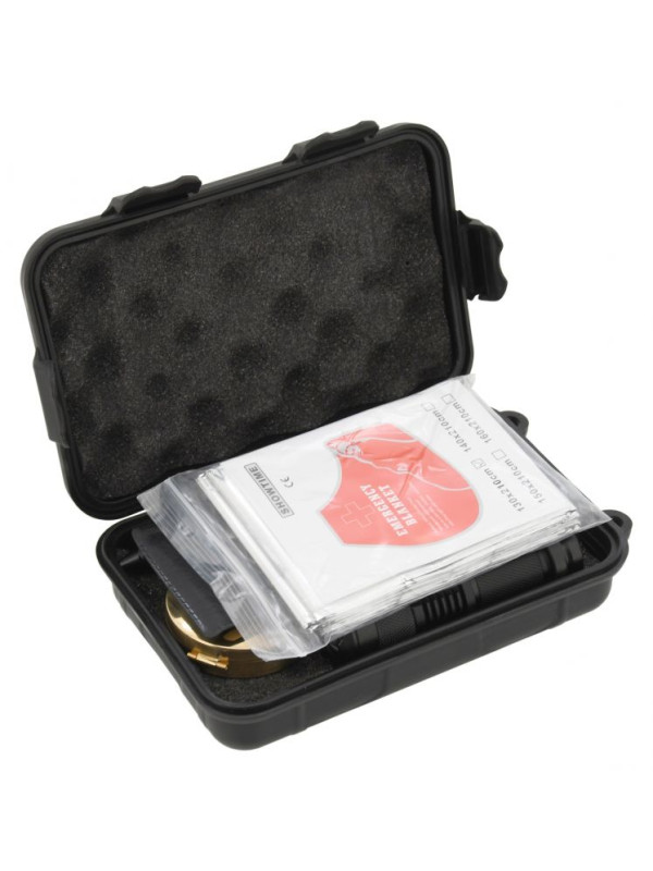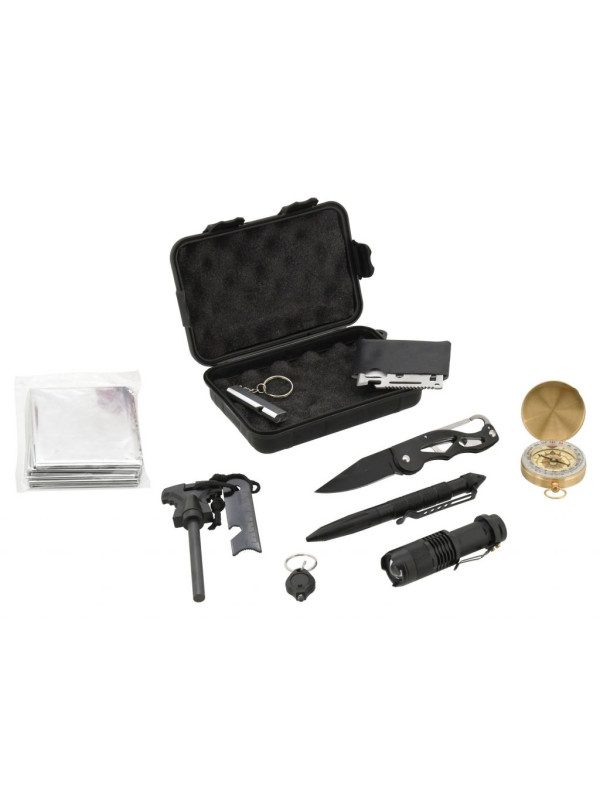 SOS sadu možno využiť ako záchranný nástroj alebo ako doplnok pre outdoor aktivity a camping. Sada pozostáva zo zatváracieho noža s čepeľou dĺžky 6,5 cm, multifunkčnej karty, píšťalky, kompasu s otočnou stupnicou, bivakovacej (izotermickej) fólie, rozmerného kresadla pre zapálenie ohňa, prívesku s LED osvetlením, celokovového pera s prierazným hrotom a LED svietidla napájaného AA batériou (batéria nie je súčasťou balenia) s nastaviteľným kužeľom vysoko výkonného svetla. Všetko je uložené v ochrannom uzatvárateľnom puzdre.