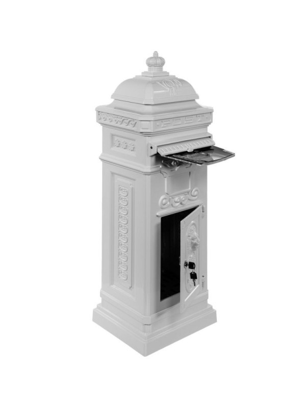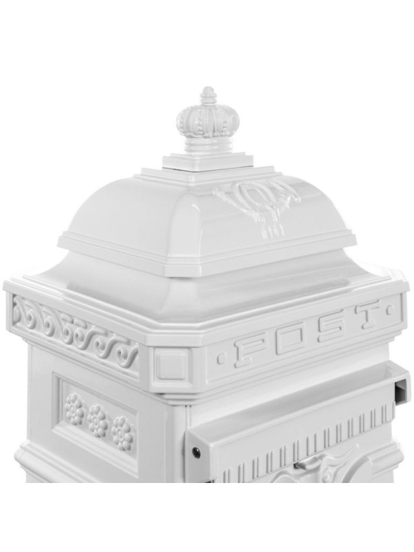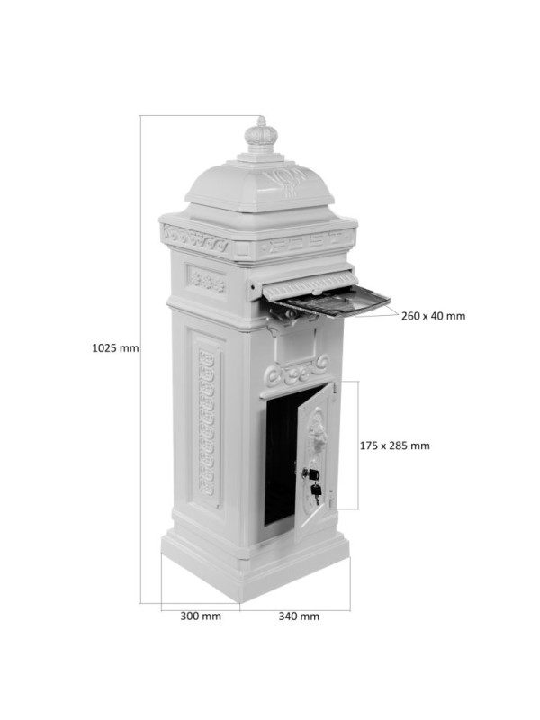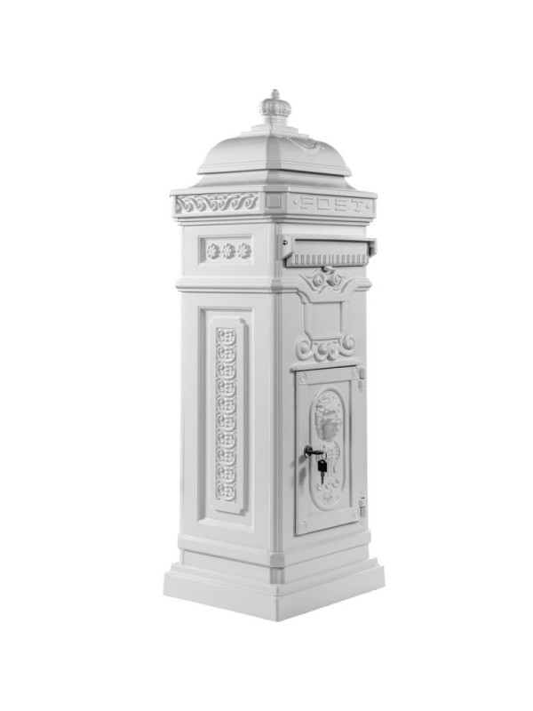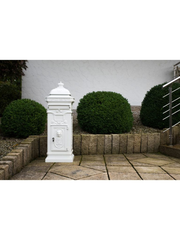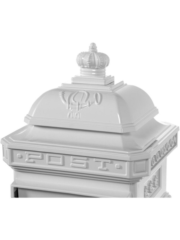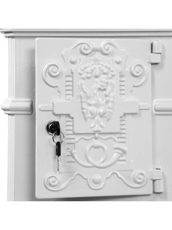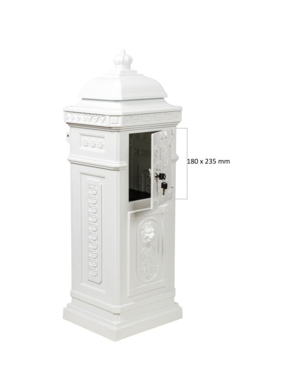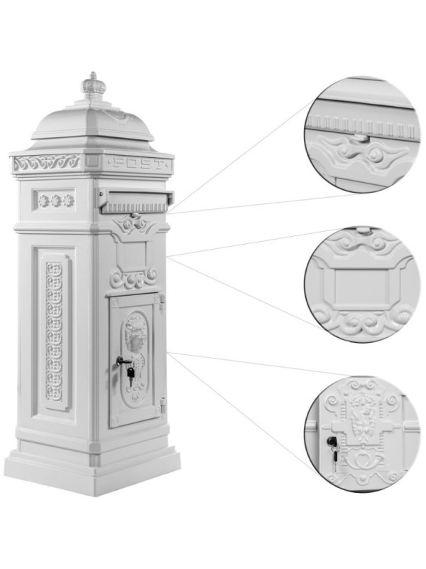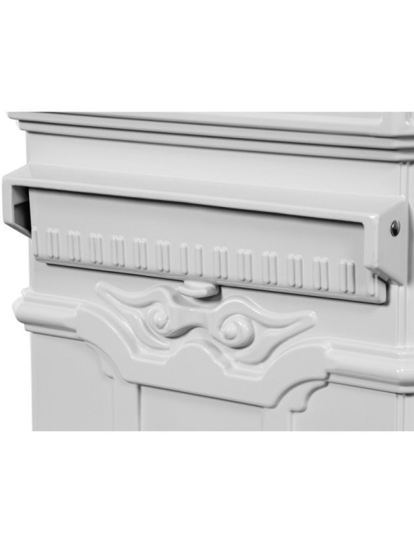 Krásna robustná poštová schránka v antickom štýle v bielej farbe. Vysoko stabilná a odolná proti poveternostným vplyvom. Ak chcete praktický a zároveň neopozeraný doplnok k vášmu domu, potom je táto schránka to pravé pre Vás! Vnútorný priestor schránky je 0,15 m³. Veľkosť otvoru pre poštu je 26 x 3 cm, takže sa do otvoru zmestia aj väčšie a hrubšie obálky, zároveň krytka schránky ochráni poštu pred nepriaznivými vplyvmi počasia.