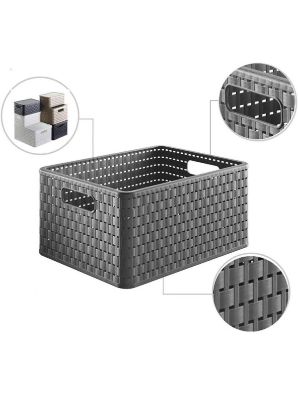 Plastový úložný box A4 v štýle ratanového výpletu s objemom 18 l ponúka široké využitie v celej domácnosti. Moderný design a kvalitné prevedenie. Úchytky na ľahké prenášanie.