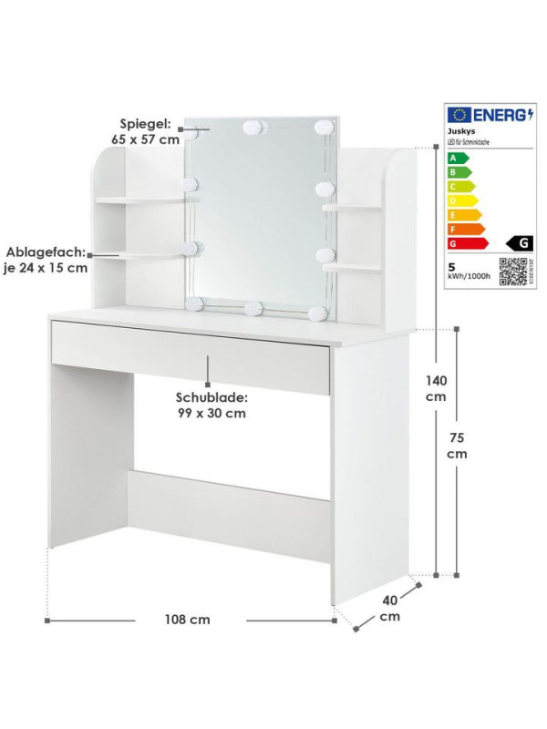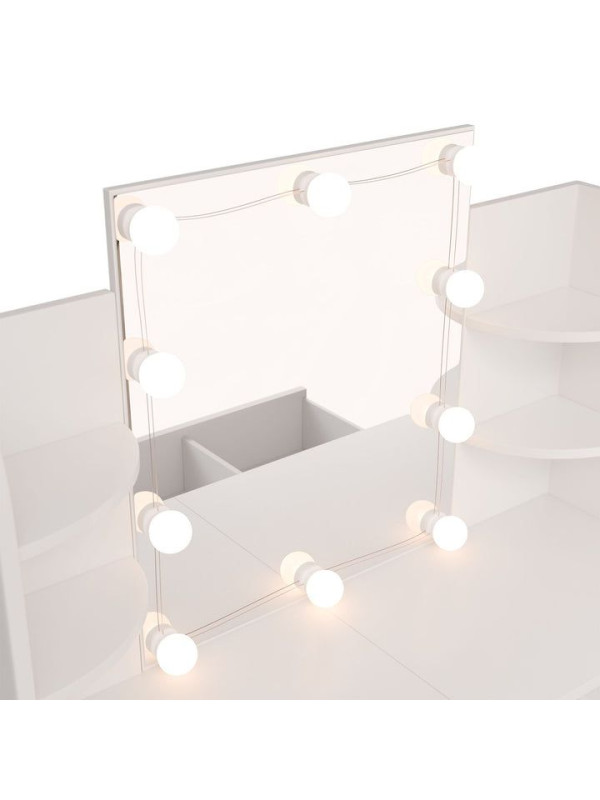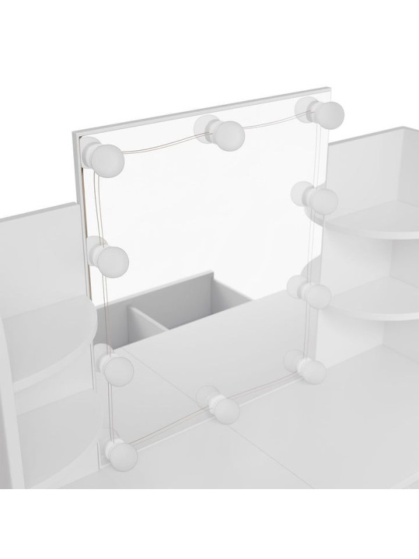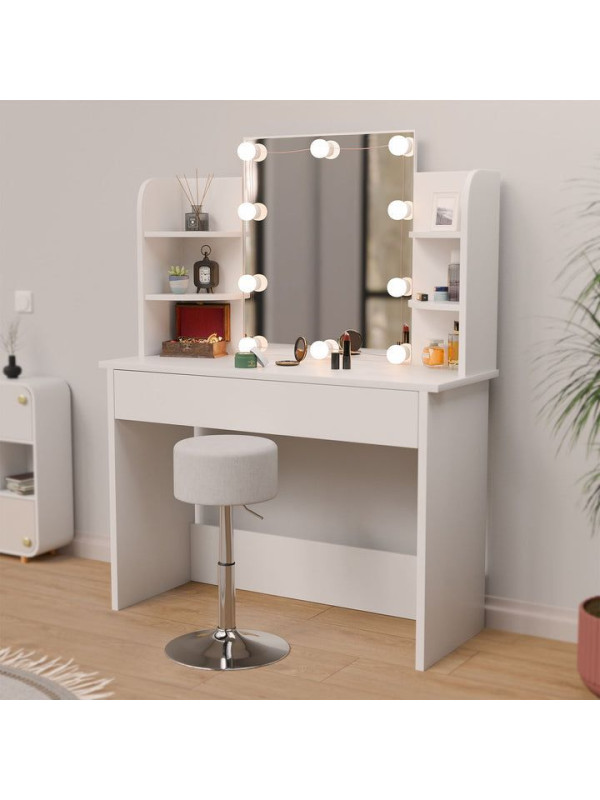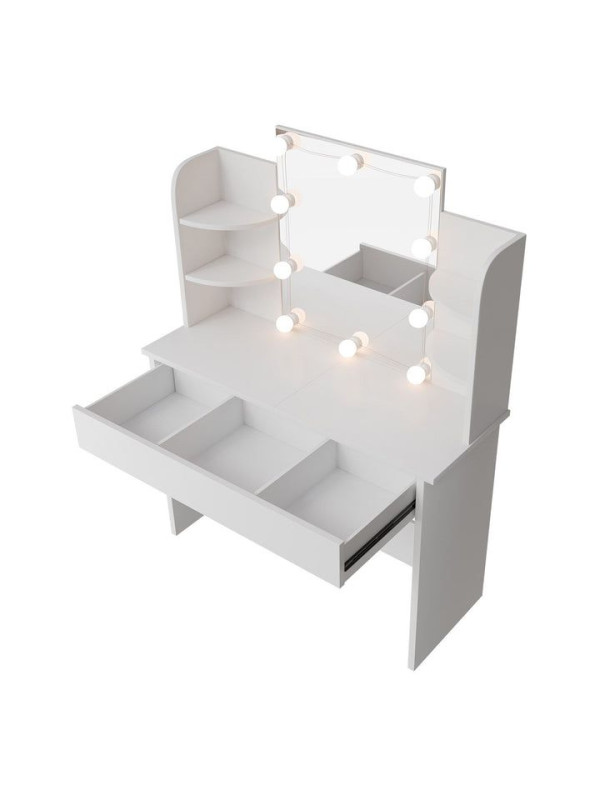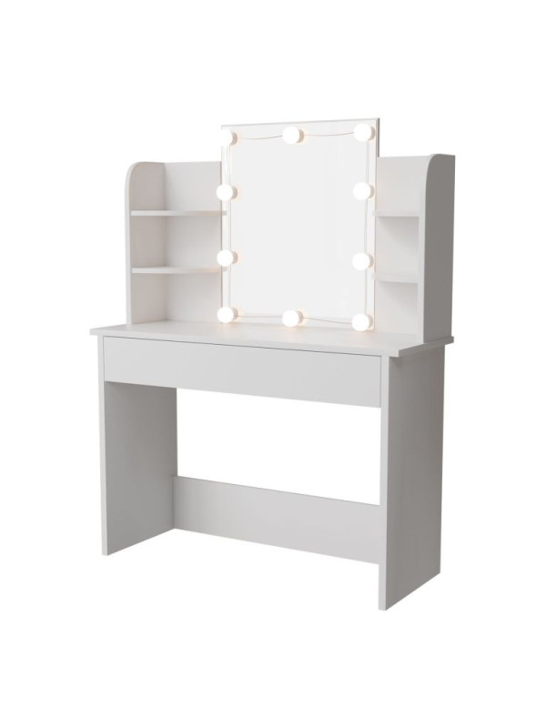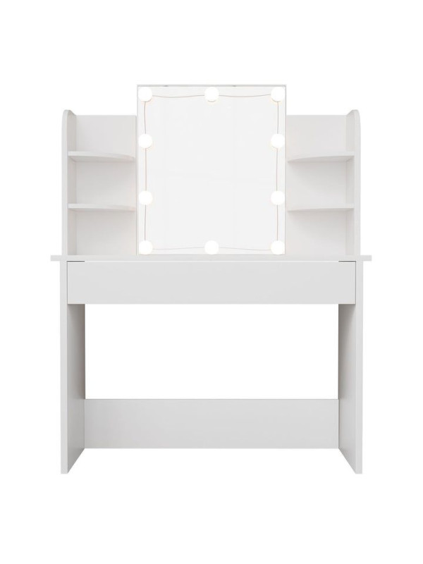 Objavte kúzlo každodenného líčenia s toaletným stolíkom, ktorý premení každé ráno na príjemný rituál. Veľké zrkadlo s LED osvetlením poskytuje dokonalé svetlo na líčenie a úpravu vlasov, zatiaľ čo elegantný biely dizajn rozžiari každú miestnosť. Veľký úložný priestor v zásuvke a na policiach vám umožní mať všetko, čo potrebujete, na dosah ruky. Vhodný pre ženy a dievčatá, ktoré si chcú dopriať chvíľku pre seba.