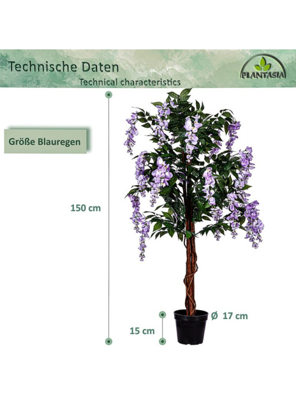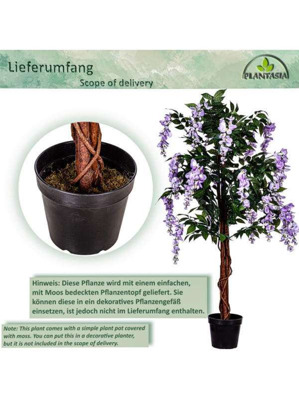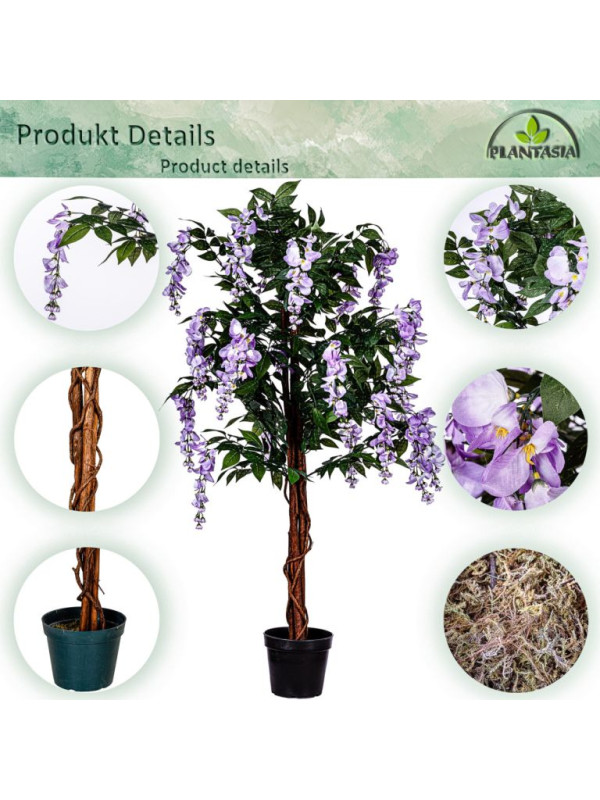 Umelý strom má autenticky zakorenený kmeň s približne 945 listami a 30 kvetnými cípmi. Vďaka detailne prepracovaným listom a kvetom vyzerá umelý stromček mimoriadne realisticky a od skutočného ho možno len ťažko rozoznať. Skutočný drevený kmeň z palmového dreva dotvára realistický vzhľad vistérie. Náš umelý stromček sa dodáva v čiernom kvetináči s Ø 18 x v 17 cm, ktorý je možné ľahko umiestniť do ozdobného kvetináča podľa Vášho výberu. Umelé rastliny nepotrebujú svetlo ani vodu a je možné ich použiť aj v miestnostiach, kam nemožno umiestniť skutočné rastliny.