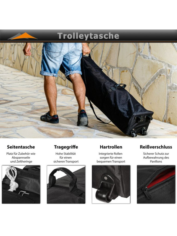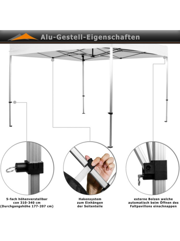 Skladací stan je vysoko kvalitne spracovaný. Na prvý pohľad zaujme nevšedným prevedením a kvalitou použitého materiálu. Stan je 100 % funkčný. Je totiž vodotesný a vďaka špeciálne impregnovanej strešnej krytine blokuje až 98 % UV slnečného žiarenia. Nerezový rám poskytuje ochranu voči poškriabaniu a korózii. Stabilitu zabezpečia zväčšené nohy konštrukcie, extrastabilný spojovací materiál a vysoko kvalitný klikací systém so zaistením vonkajšou skrutkou s ťažným krúžkom. Pre podpororu strechy je integrovaný stredový napínací stĺpik.