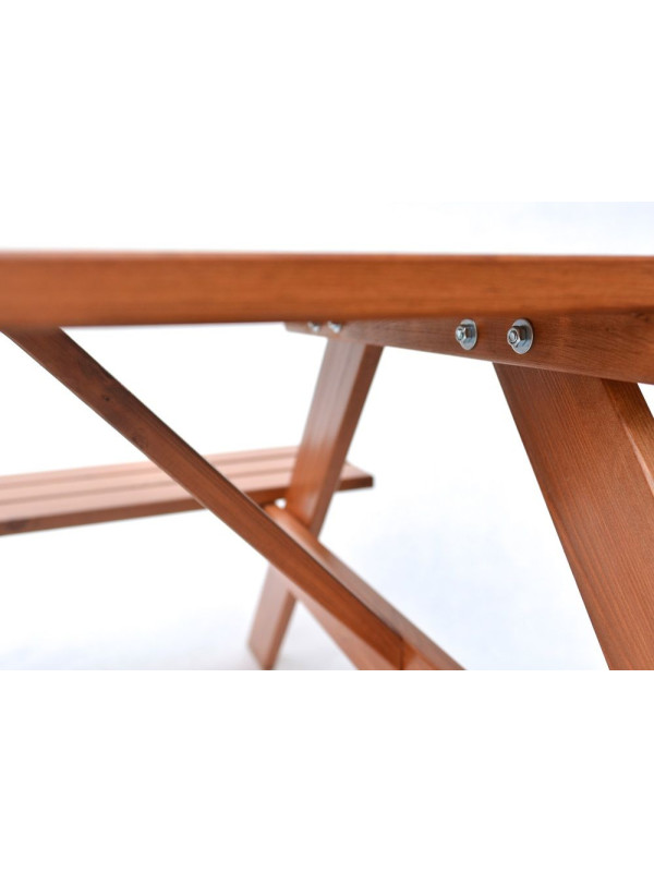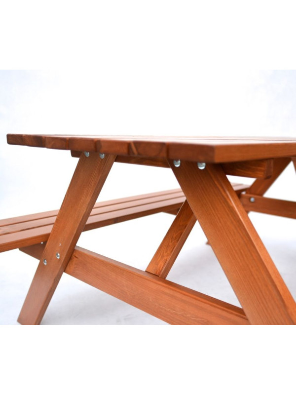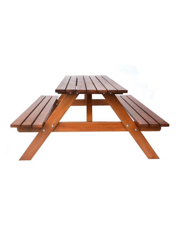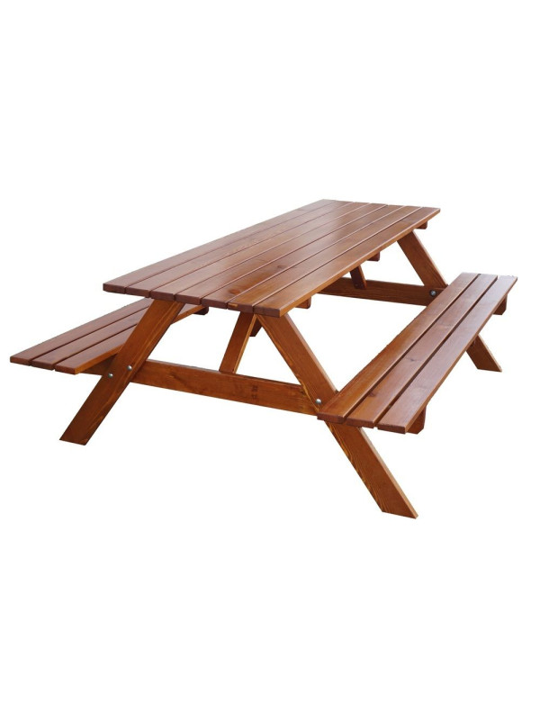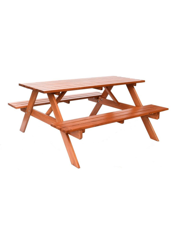 Záhradná zostava PIKNIK je zhotovená z kvalitného borovicového dreva. Drevo je lakované do gaštanovej farby. Zostava sa skladá zo stola a dvoch lavíc, ktoré sú pripojené k stolu. Certifikát FSC zákazníkom zaručuje, že drevo, z ktorého je výrobok zhotovený, je kvalitné a zdravé.