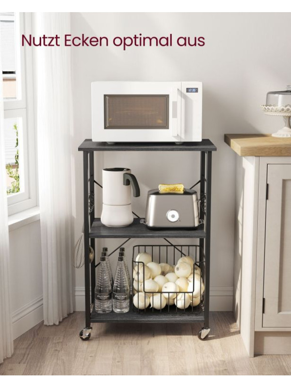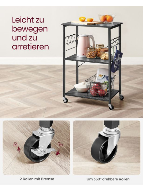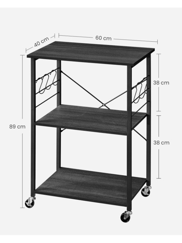 Kuchynský vozík s 3 policami a háčikmi, čierny, 60x40x84 cm