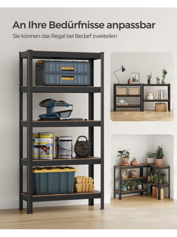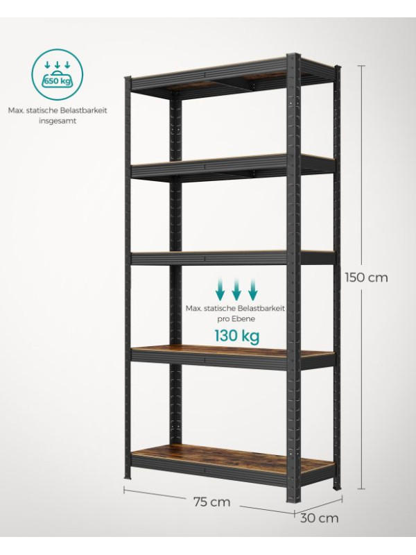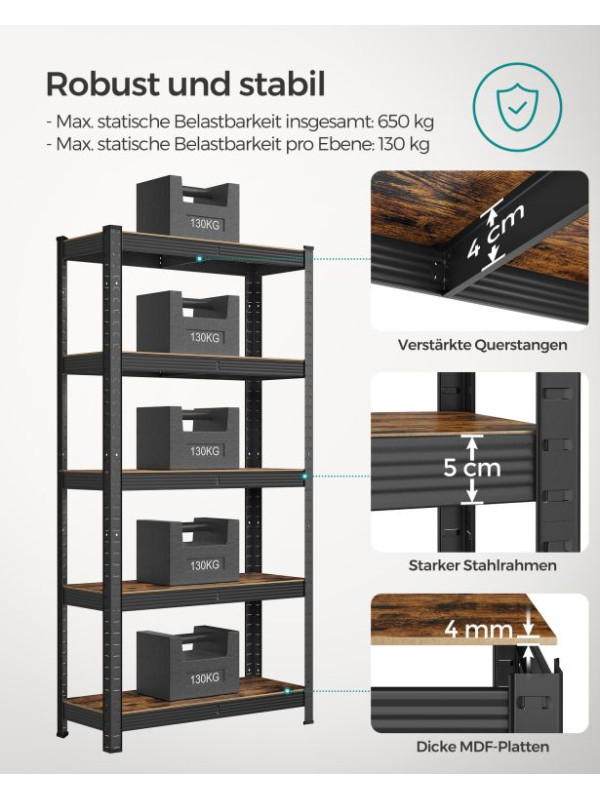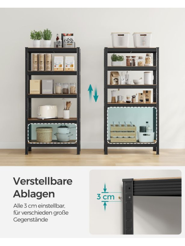 Objavte spojenie pevnosti a štýlu v jednom. Kovový regál SONGMICS s rustikálne hnedými policami a čiernym rámom ponúka nosnosť až 650 kg a nastaviteľnú výšku jednotlivých políc. Vďaka univerzálnemu dizajnu sa hodí do obývačky, kuchyne aj garáže a prinesie poriadok aj eleganciu do každého priestoru.