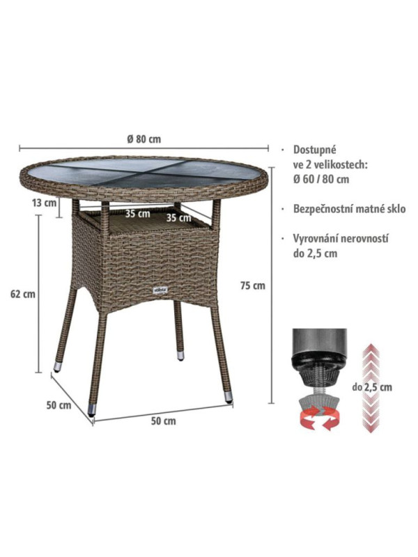 Robustná oceľová konštrukcia je zabalená do polyratanového prútia odolného proti poveternostným vplyvom a UV žiareniu, takže náš konferenčný stolík je ideálny na vonkajšie použitie. Vďaka predmontovaným vyrovnávacím skrutkám na bistro stole je možné veľmi ľahko vyrovnať stôl, ak by ste mali nerovný povrch podlahy. Obzvlášť stabilná stolová doska zo satinovaného bezpečnostného skla.