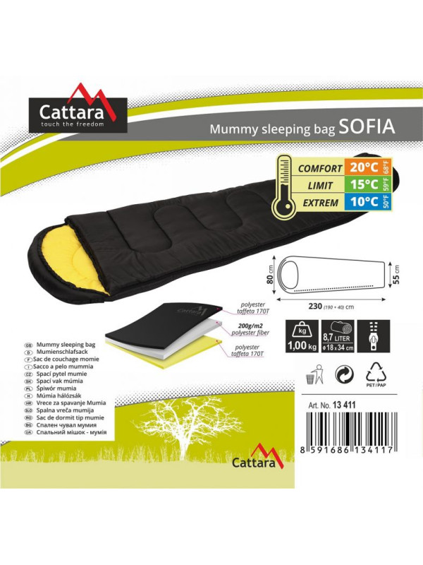 Spací vak múmia Sofia je spacákom, ktorý dokonale kopíruje telo a má tak najlepšie tepelnoizolačné vlastnosti a je vybavený sťahovacou kapucňou chrániacou hlavu. Na komfort a teplotu vo vnútri spacieho vaku má vplyv oblečenie. Spánok je doporučený len v spodnom prádle, prípadne s tričkom. Je totiž dôležité vyhriať si spacák a zbytočne neohrievať oblečenie. Spacák Sofia je vybavený tromi vrstvami. Spacáky vyberáme hlavne podľa ich teplotných limitov, kde Comfort značí teplotu, pri ktorej nám bude príjemne, Limit je teplota, pri ktorej ešte budeme v teple a v neposlednom rade je tu teplota Extrem, ktorá udáva maximálnu únosnú teplotu.