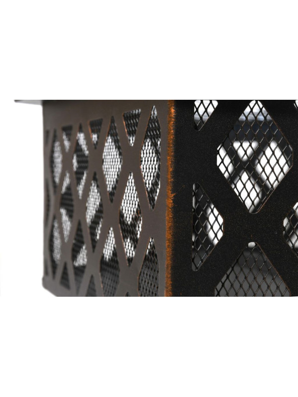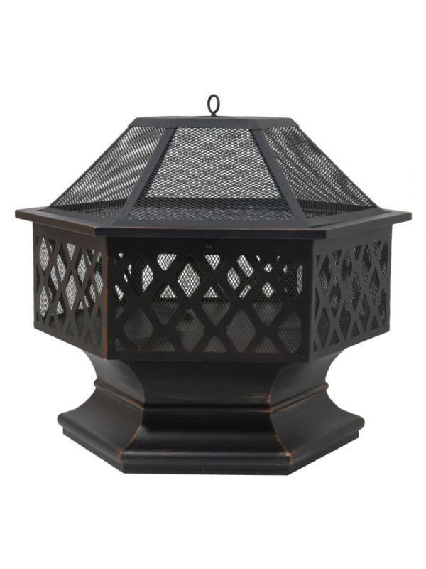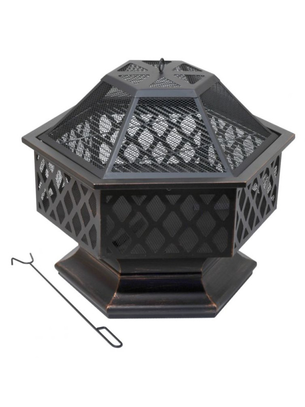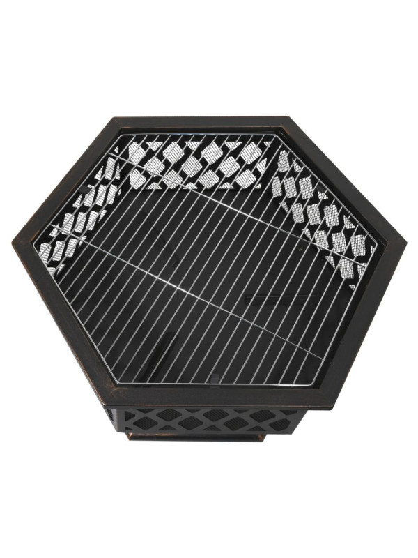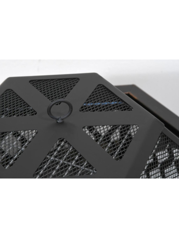 Prenosné ohnisko na drevo HEXAGON so šesťuholníkovou konštrukciou vhodné na terasy a záhrady. Konštrukcia ohniska je vyrobená z kvalitnej ocele s vysokoteplotným čiernym/medeným náterom s patinou. Na grilovanie je ohnisko vybavené oceľovým roštom s rozmermi 61 x 53 cm. Špeciálne tvarovaný poklop s pletivom poslúži ako ochrana pred iskrami, čo výrazne zvyšuje bezpečnosť a pohodlie. Ohnisko je navyše vybavené pevným podstavcom, jeho umiestnenie tak ponúka skrášlenie priestoru.