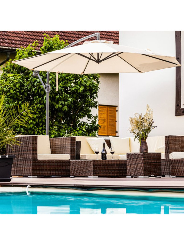 Slnečník vrátane poťahu je vyrobený z pevného polyesteru 180 g/m² so stabilnou oceľovou konštrukciou a ponúka mnoho farieb. Náš slnečník je možné pohodlne otvoriť a zavrieť pomocou ručnej kľučky. Optimálny tieň získate vďaka nastaviteľnému uhlu slnečníka a otočnému ramenu do všetkých strán. Slnečník poskytuje ochranu pred slnečnými lúčmi, cirkuláciu vzduchu podporuje integrovaná strieška, ktorá zabraňuje hromadeniu tepla. Vodoodpudivý poťah navyše poskytuje ochranu proti miernemu dažďu.