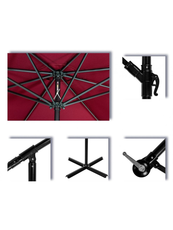 Slnečník vrátane poťahu je vyrobený z pevného polyesteru 180 g/m² so stabilnou oceľovou konštrukciou a ponúka mnoho farieb. Náš slnečník je možné pohodlne otvoriť a zavrieť pomocou ručnej kľučky. Optimálny tieň získate vďaka nastaviteľnému uhlu slnečníka a otočnému ramenu do všetkých strán. Slnečník poskytuje ochranu pred slnečnými lúčmi, cirkuláciu vzduchu podporuje integrovaná strieška, ktorá zabraňuje hromadeniu tepla. Vodoodpudivý poťah navyše poskytuje ochranu proti miernemu dažďu.