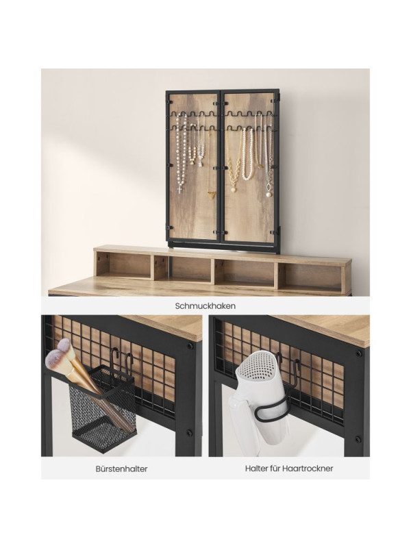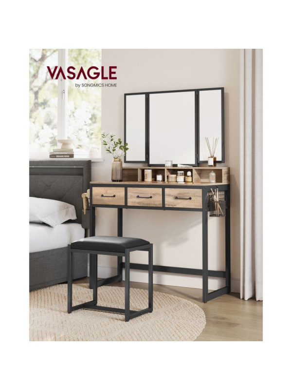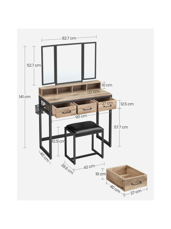 Stôl je vyrobený z vysoko kvalitnej drevotriesky a pevnej ocele, čo zaručuje jeho odolnosť a stabilitu. Trojité zrkadlo vám umožňuje vidieť sa z rôznych uhlov, zatiaľ čo háčiky a držiaky uľahčujú uloženie fénu, kefiek a šperkov. Montáž je jednoduchá, údržba je jednoduchá a nosnosť stoličky až 150 kg zaručuje pohodlie a bezpečnosť.