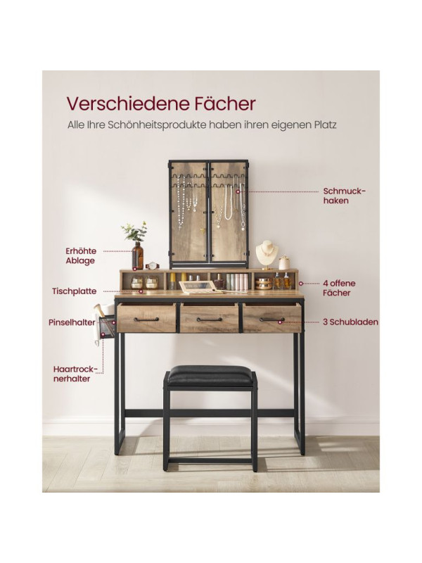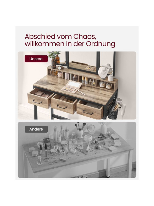 Premeňte svoju každodennú starostlivosť o seba na jedinečný zážitok. Tento toaletný stolík s trojitým zrkadlom ponúka dostatok priestoru pre všetky vaše kozmetické poklady a šperky. Vďaka premyslenému usporiadaniu priehradiek a zásuviek budete mať všetko prehľadne po ruke a vaše ráno začne s úsmevom.