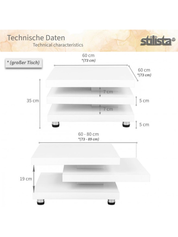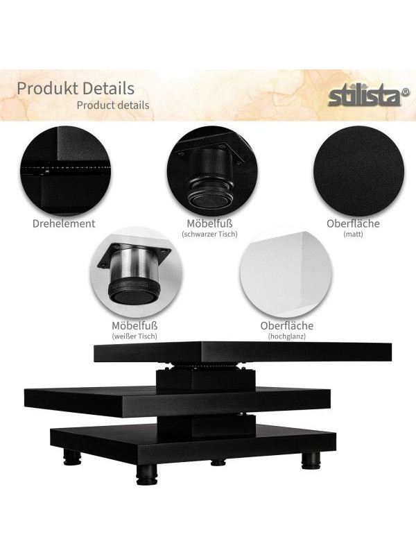 Tento konferenčný stolík je skutočným vrcholom Vášho domova a zaujme svojim dizajnom a kvalitou. Dve horné stolové dosky je možné otočiť o 360 °, takže si stolík môžete upraviť podľa seba a Vášho priestoru. Má nastaviteľné nôžky s chráničmi podlahy. Úložný priestor odkladacieho stolíka medzi doskami je ideálny na uloženie časopisov, diaľkových ovládačov a mnoho ďalšieho.