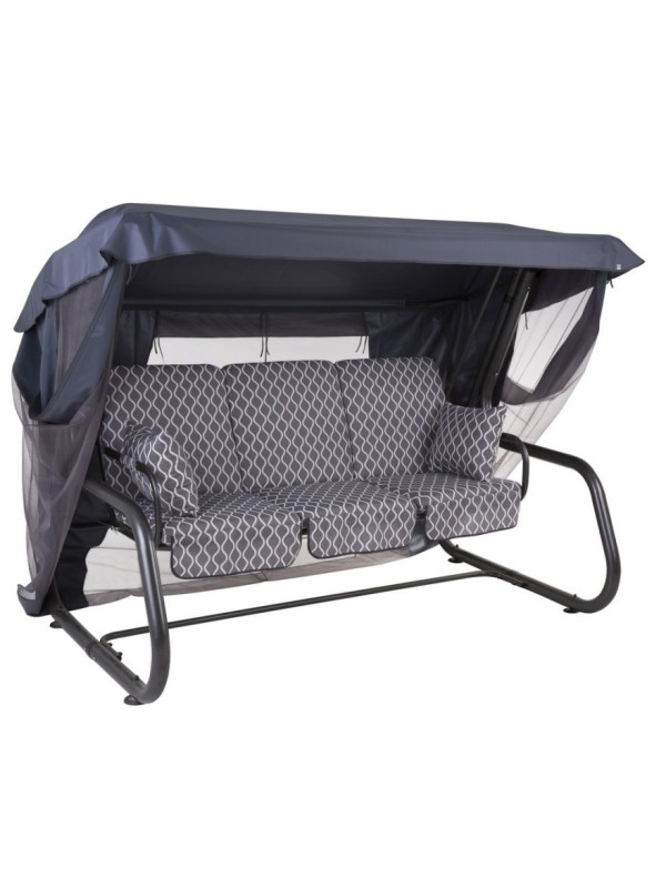 Hojdačka je určená pre 4 osoby s rozkladacou sedačkou, ktorá je upevnená na pružinách. Robustná, výkonná konštrukcia hojdačky, hrúbka nosnej rúrky: Ø 63 x 1,5 mm. Rám maľovaný práškovou polyesterovo-epoxidovou farbou v antracitovom odtieni. Sedadlo je možné sklopiť do polohy ležmo na chrbte. Strieška na hojdačku Venezia s moskytiérou vyrobená z polyesteru má špeciálne tunely prispôsobené k strešnej konštrukcii hojdačky. Farba striešky: svetlosivá. Moskytiéru možno odopnúť. V sade s hojdačkou sú tiež 3 ks sedákov.
