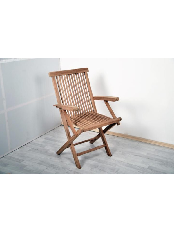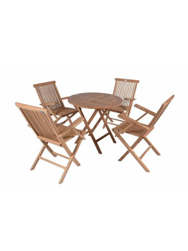"Diver záhradný exteriérový nábytok z tíkového dreva s opierkami Garth Táto exkluzívna sada z tíkového dreva sa skladá z 1 stola a 4 stoličiek. Pohodlné skladacie stoličky s opierkami aj stôl sú vyrobené z kvalitného tíku a vynikajú veľmi starostlivým spracovaním. Táto krásna sedacia súprava sa hodí predovšetkým na terasy a záhrady, kde si môžete s vašou rodinou a priateľmi užívať príjemné posedenie. Technické údaje: · Materiál: tíkové drevo je odolné voči poveternostným vplyvom a neštiepi sa. Aj bez ošetrovania vydrží po niekoľko generácií. · Stôl: _ 100 cm, výška: 75 cm · Skladacia stolička: 62 x 48 x 98 cm · Váha: 10 kg Obsah balenia: · 4 x skladacie stoličky · 1 x stôl"
