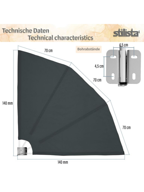 Balkónová zástena STILISTA Vás ochráni nielen pred zvedavými pohľadmi, ale aj pred slnečným žiarením UV 50+ a vetrom. Naša diskrétna zástena na ochranu súkromia harmonicky zapadne do Vášho balkóna, terasy alebo záhrady. Po použití je možné balkónovú zástenu ľahko zložiť a ušetriť tak miesto. Dodáva s montážnym materiálom a ochranným krytom.