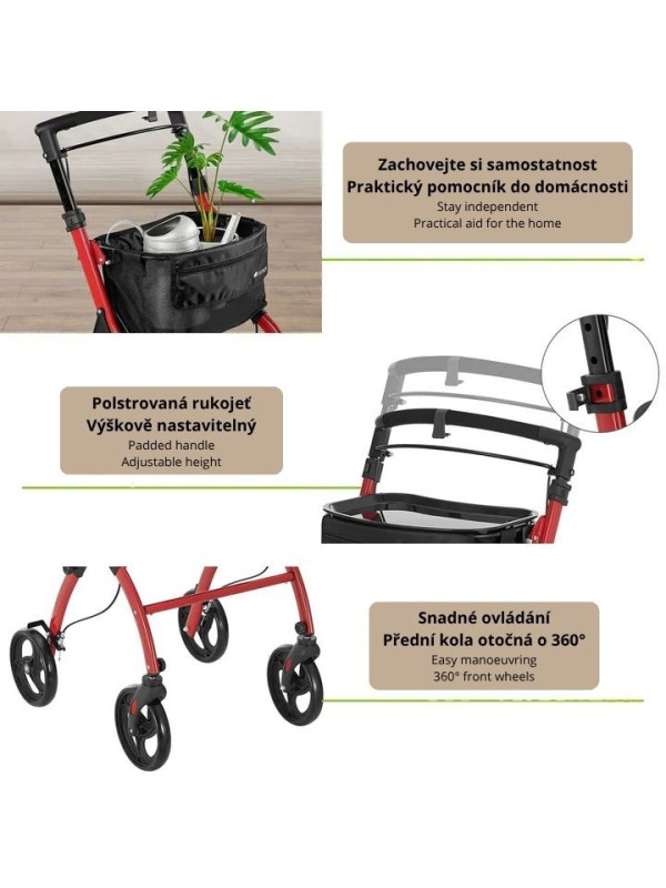 Zažite voľnosť pohybu v každej miestnosti vášho domova! Moderné červené chodítko je ideálnou voľbou pre tých, ktorí hľadajú istotu a pohodlie pri chôdzi. Vďaka ľahkej konštrukcii a kompaktným rozmerom je vhodné aj do menších bytov. Polstrované rukoväte a otočné kolieska uľahčia každodenné používanie.