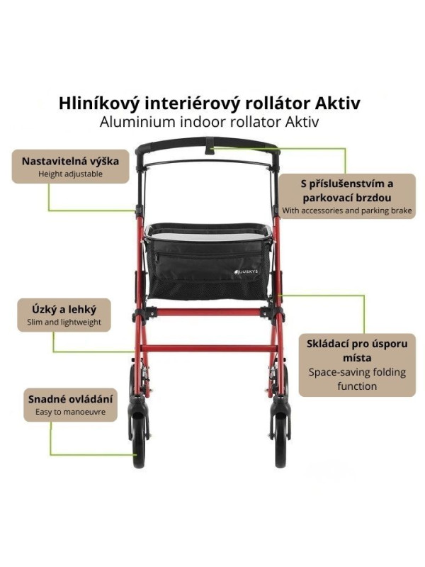 Hliníkový rám je pevný a odolný, zvládne zaťaženie až 110 kg. Výškovo nastaviteľná rukoväť a ľahké skladanie zaručí maximálne prispôsobenie aj úsporu miesta. Bezpečnostná brzda na zadných kolesách a ľahká údržba sú samozrejmosťou.