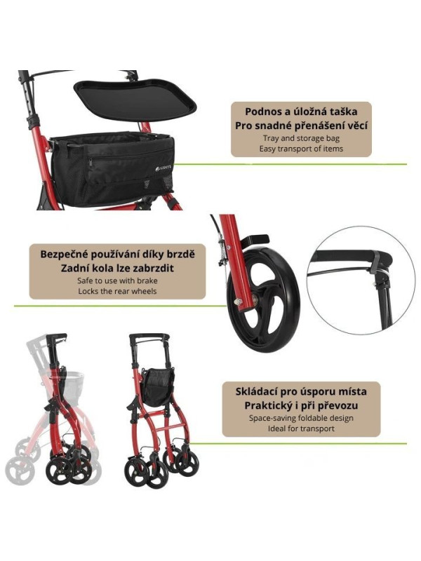 Skladacie hliníkové chodítko s brzdou a taškou, červené