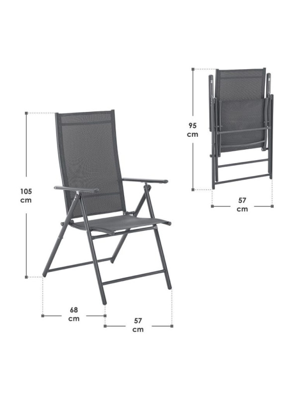 Doprajte si chvíle odpočinku na čerstvom vzduchu so sadou dvoch skladacích stoličiek Calena. Vďaka nastaviteľnej opierke si ľahko zvolíte polohu, ktorá vám vyhovuje - či už si chcete vychutnať jedlo na terase, opaľovať sa pri bazéne alebo si len v pokoji prečítať obľúbenú knihu. Elegantný antracitový odtieň navyše dodá vašej záhrade alebo balkónu moderný nádych.