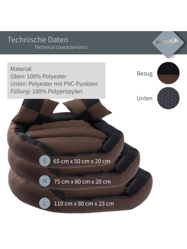 Tento pelech je príjemným miestom na spanie pre psa, mačku alebo iných domácich miláčikov. Náš pelech je vhodný tiež ako doplnok k búde alebo prepravnému boxu. Je obzvlášť pohodlný vďaka mäkkej výplni a odnímateľnému obojstrannému vankúšu, ktorý je šetrný aj ku kĺbom štvornohého priateľa. Kryt je vodoodpudivý, aby sa zabránilo priamemu vniknutiu kvapalín. Celý pelech je možné prať ručne alebo v práčke pri nízkych teplotách. Spodná strana koša pre psov je opatrená ďalšími protišmykovými výstupkami.