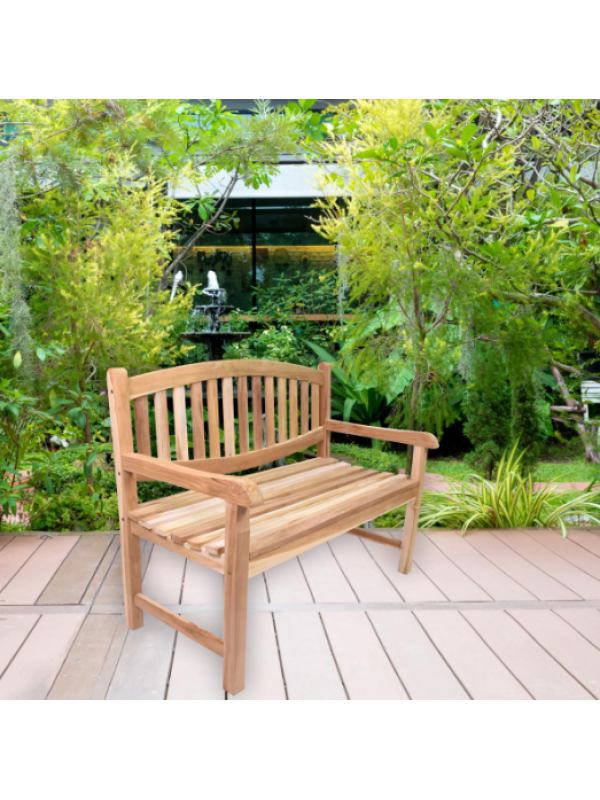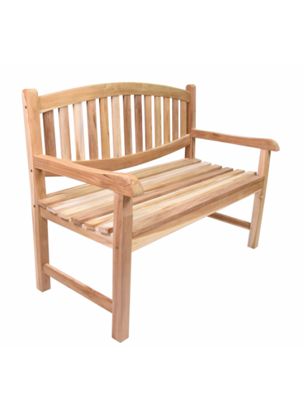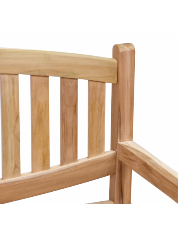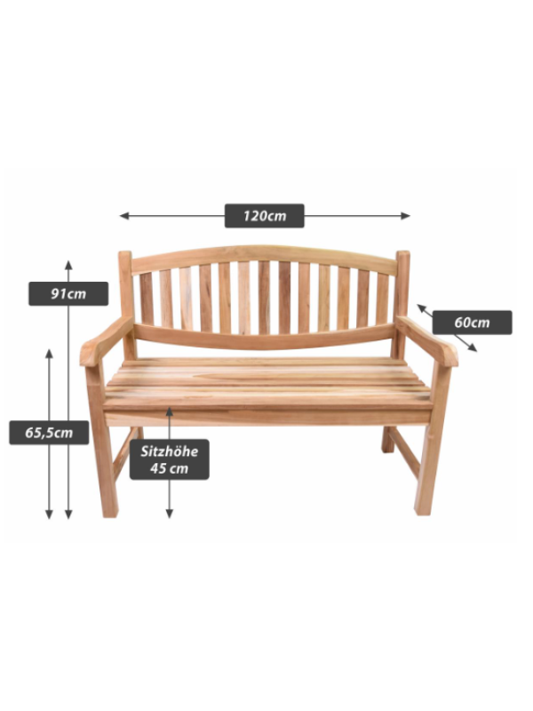 Lavica je vyrobená z masívneho, udržateľného teakového dreva, neošetreného, s rozmermi približne 120 × 57 × 94 cm a hmotnosťou približne 23 kg. Vďaka precíznemu ručnému spojeniu a odolnému materiálu poskytuje stabilné sedenie pre dve osoby a odoláva vonkajším podmienkam. Odporúčame pravidelnú údržbu teakovým olejom, aby sa zachovala prirodzená krása dreva.