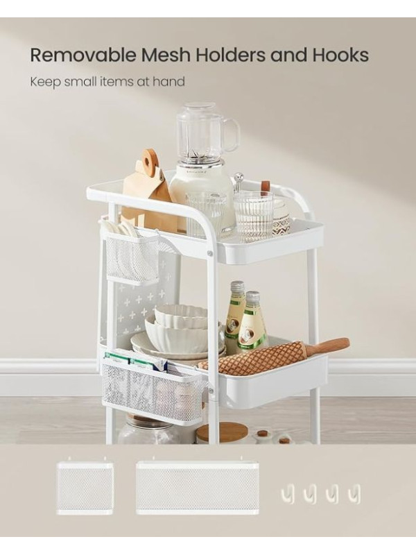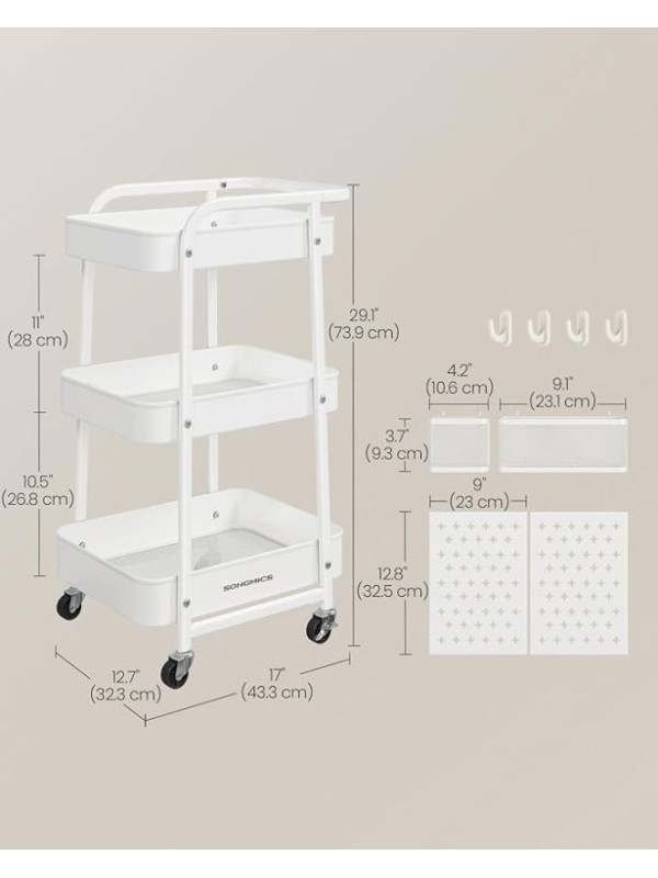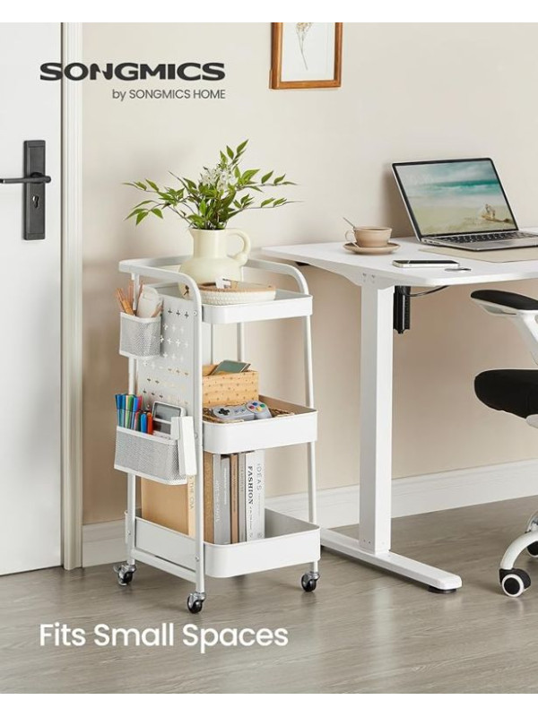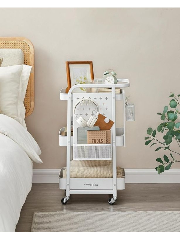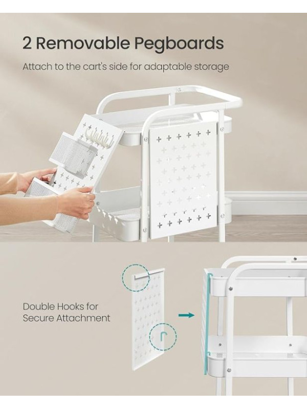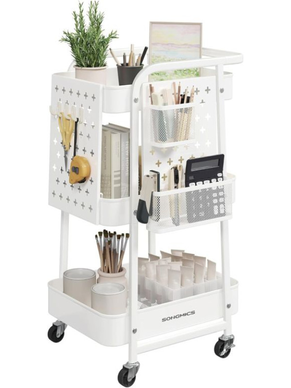 Objavte univerzálny mobilný regál, ktorý vám pomôže udržiavať poriadok v každej miestnosti. Vďaka trom priestranným policám, háčikom a dodatočným doskám s otvormi môžete ľahko uložiť všetko, čo potrebujete – od kuchynského riadu až po kreatívne potreby. Elegantný biely dizajn sa perfektne hodí do moderného interiéru a umožňuje vám mať všetko po ruke.