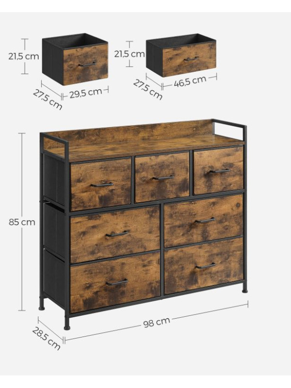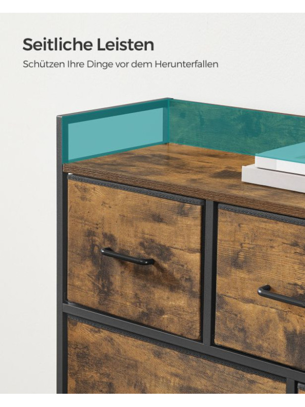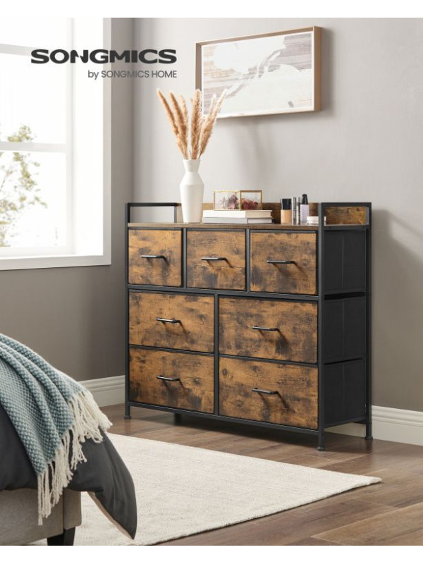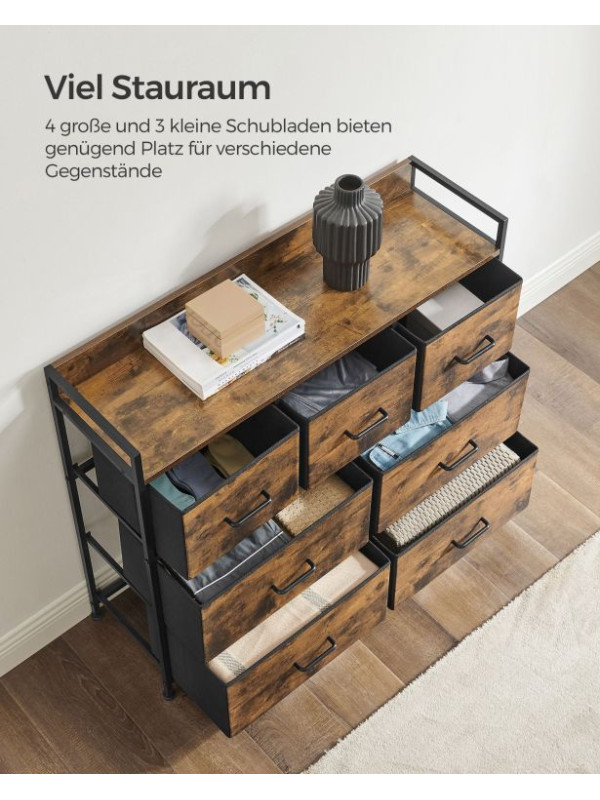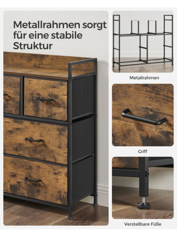 Rustikálna komoda s kovovým rámom, 7 zásuviek, čierna/hnedá