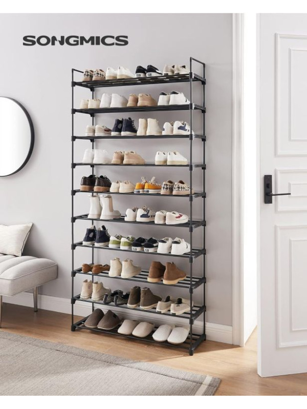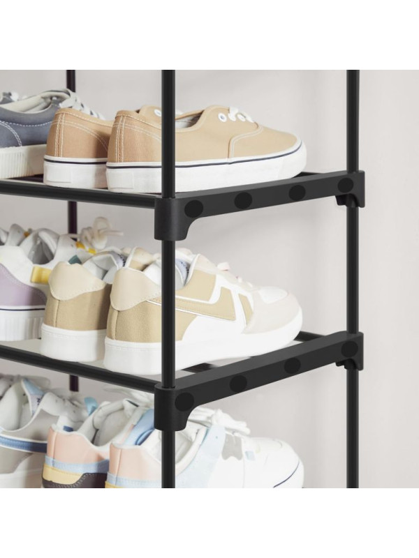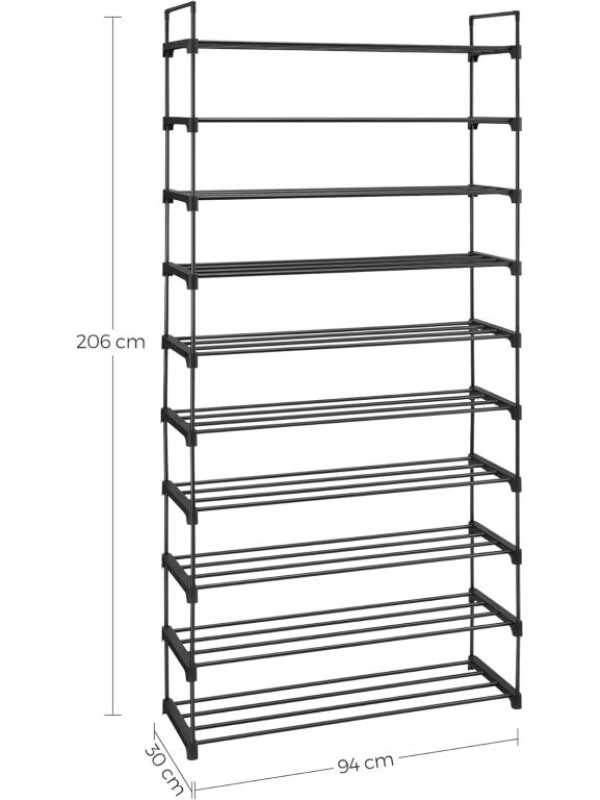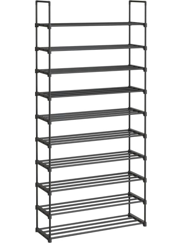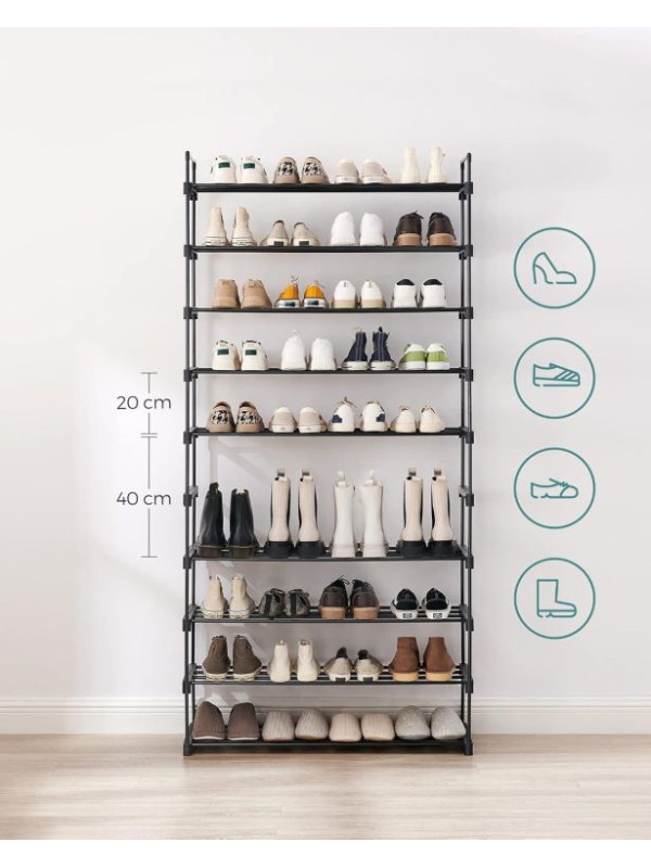 Tento vysoký botník je ideálnym riešením pre každého, kto potrebuje maximálny úložný priestor na čo najmenšej ploche. Vďaka 10 úzkym policam pojme až 50 párov topánok, pričom jeho subtílna konštrukcia ponechá vašej predsieni alebo šatni stále vzdušný vzhľad. Ľahko zapadne do moderného interiéru a vďaka univerzálnej čiernej farbe nebude pútať nežiaducu pozornosť.