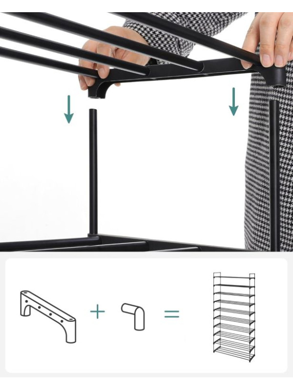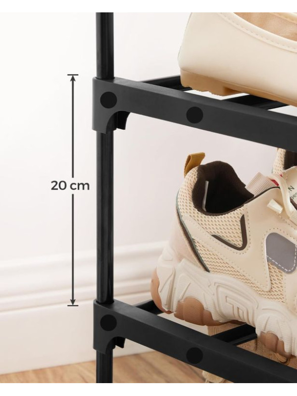 Botník je vyrobený z kovových trubiek a odolných plastových spojov, ktoré zaisťujú stabilitu a dlhú životnosť. Každá polica unesie až 4–5 kg, a preto si poradí s bežnou obuvou aj ťažšími pármi. Konštrukciu je možné upraviť, rozdeliť na dve menšie časti alebo prispôsobiť miestu pre vyššie topánky. Súčasťou je aj bezpečnostný systém proti prevráteniu, ktorý ocenia najmä praktickí zákazníci.