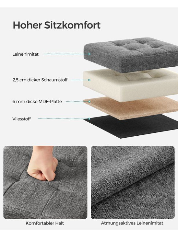 Vneste do svojho interiéru štýl a praktickosť v jednom. Elegantný taburet SONGMICS v tmavo šedom prevedení kombinuje moderný dizajn s vysokým komfortom sedenia. Vďaka čalúneniu z imitácie ľanu a mäkkej pene pôsobí útulne a zároveň reprezentatívne. Skvele zapadne do obývacej izby, spálne alebo študentského bytu.