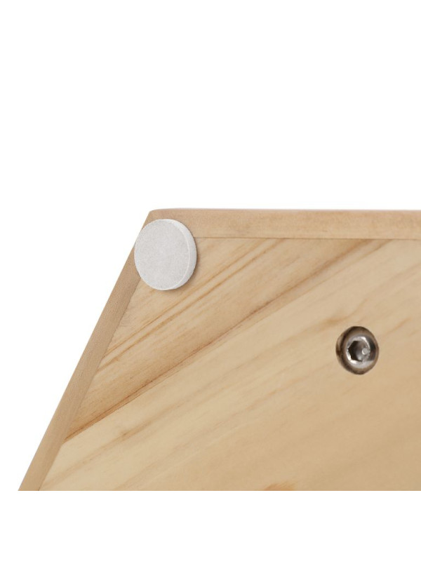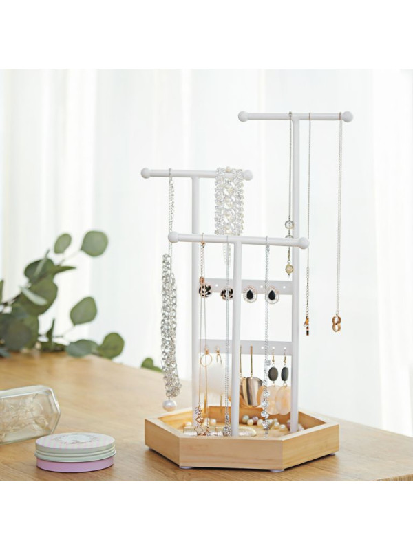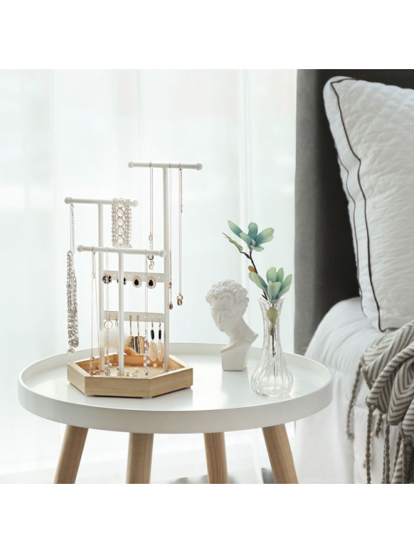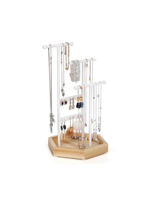 Hexagonálna drevená základňa zaisťuje stabilitu, zatiaľ čo tri T-tyče v rôznych výškach umožňujú zavesenie rôznych druhov šperkov. 16 otvorov poskytuje miesto pre náušnice a prstene. Jednoduchá montáž vďaka skrutkám a gumovým tesneniam.