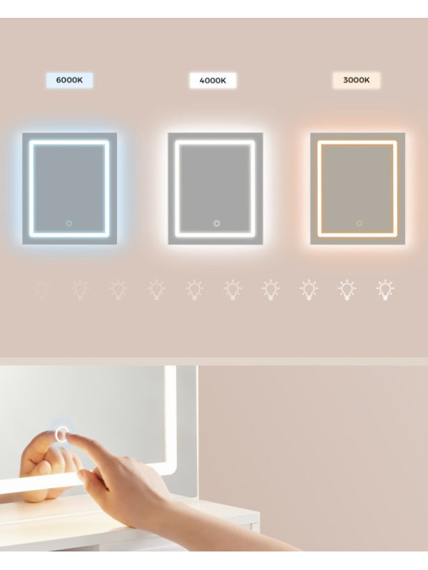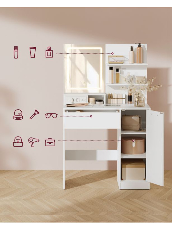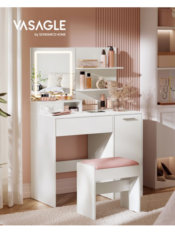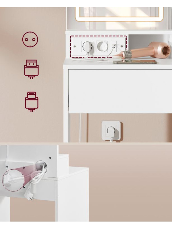 Kozmetický stolík s LED zrkadlom, USB, biely, 80x40x132,5 cm