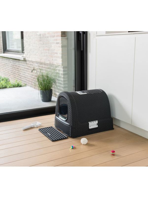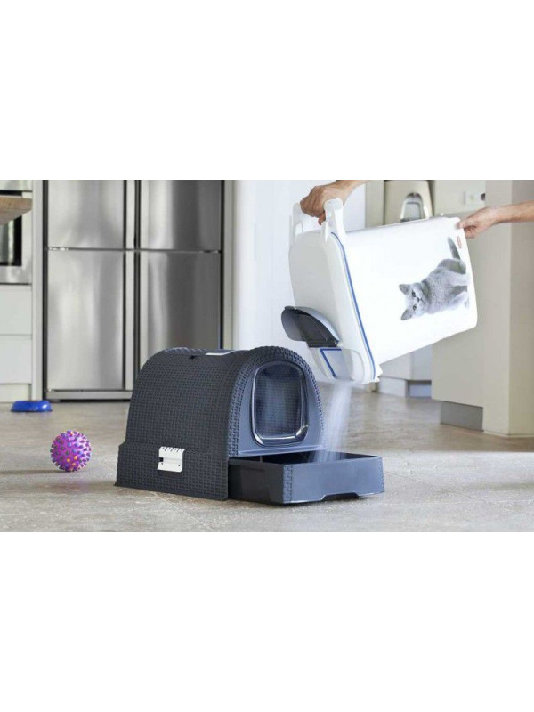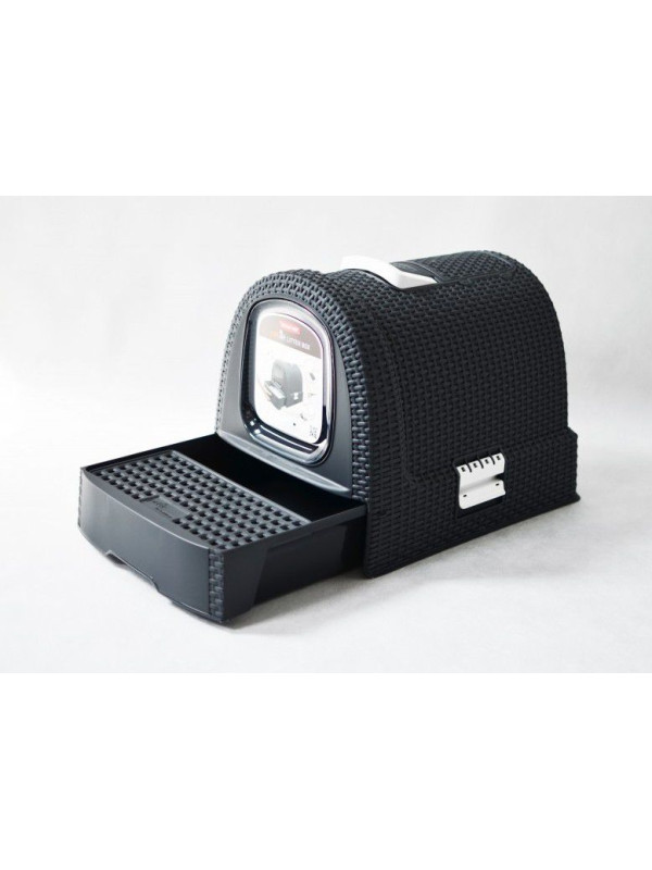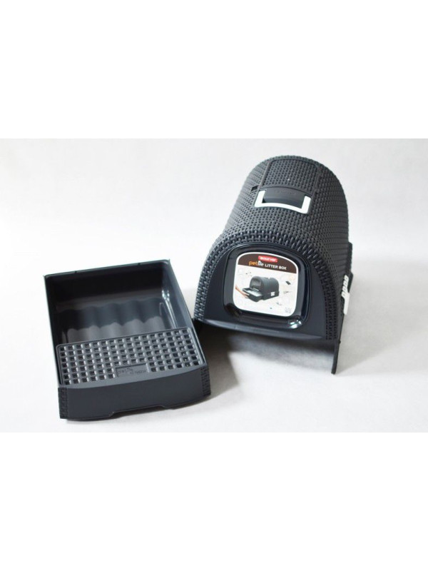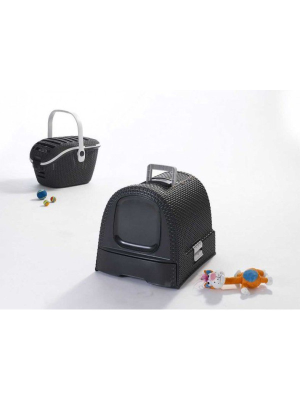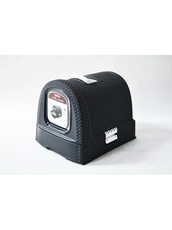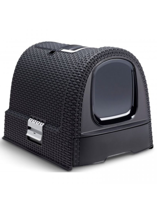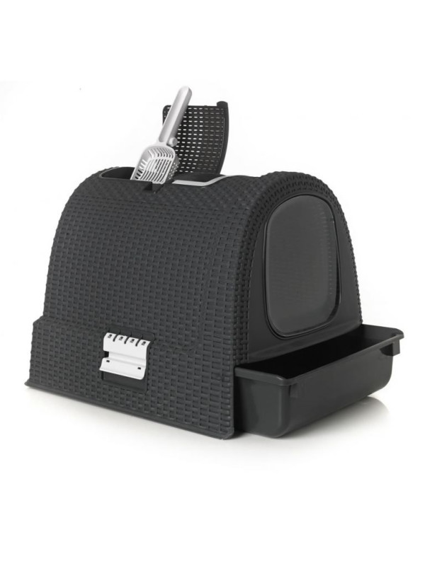 Elegantní toaleta pro kočky (šedé barvy), toaleta tak nepůsobí rušivě v interiéru.Krásný design v ratanovém stylu.Boční klipy pro jednoduché otevření při čištění, výsuvná spodní zásuvka na podestýlku.Dvířka jsou výklopná a v horní části toalety je filtr, který zachytí zápach.Součástí je lopatka na čištění steliva a předložka.Snadno se přenáší díky rukojeti.