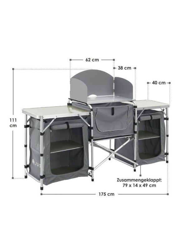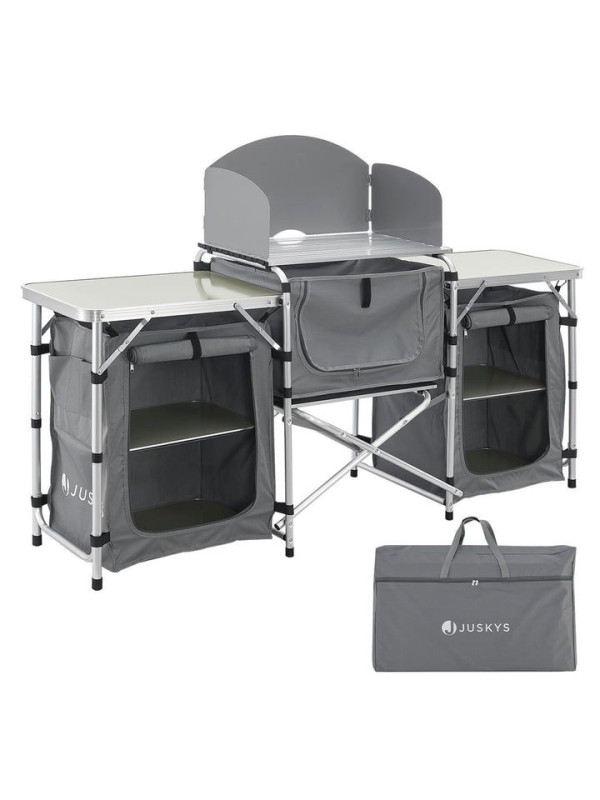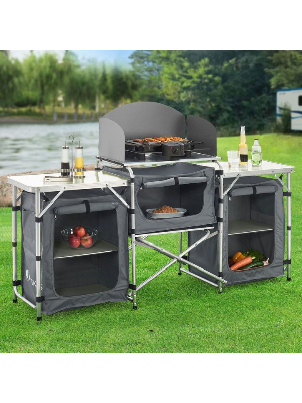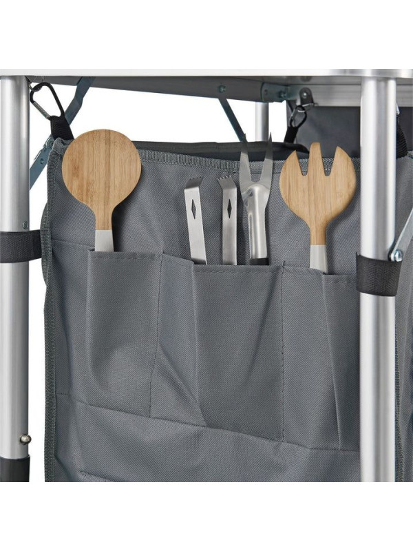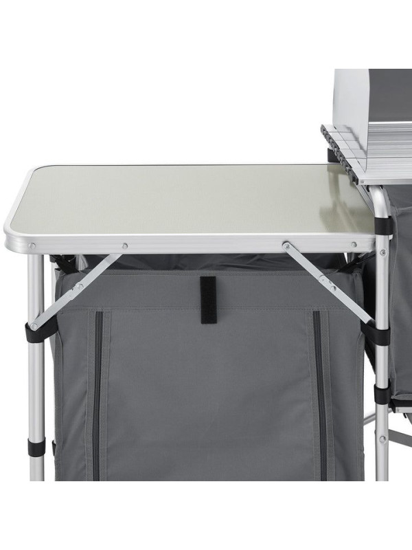 Skladacie kuchynské zariadenie je ideálnou voľbou pre každého, kto chce mať pri kempovaní alebo v záhrade všetko po ruke. Veľké pracovné plochy a množstvo odkladacích políc vám umožnia pohodlne pripraviť akékoľvek jedlo. Vďaka prenosnej taške je kuchynské zariadenie vždy pripravené na vaše ďalšie dobrodružstvo.
