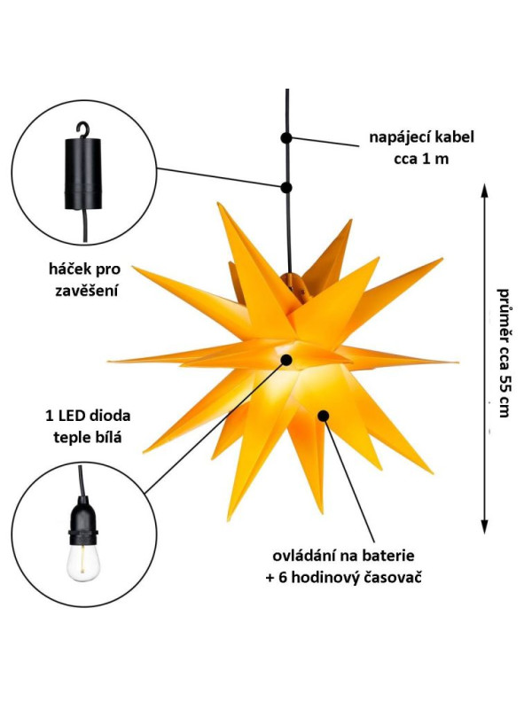 Vianočná dekorácia - hviezda s časovačom 1 LED, 55 cm, žltá