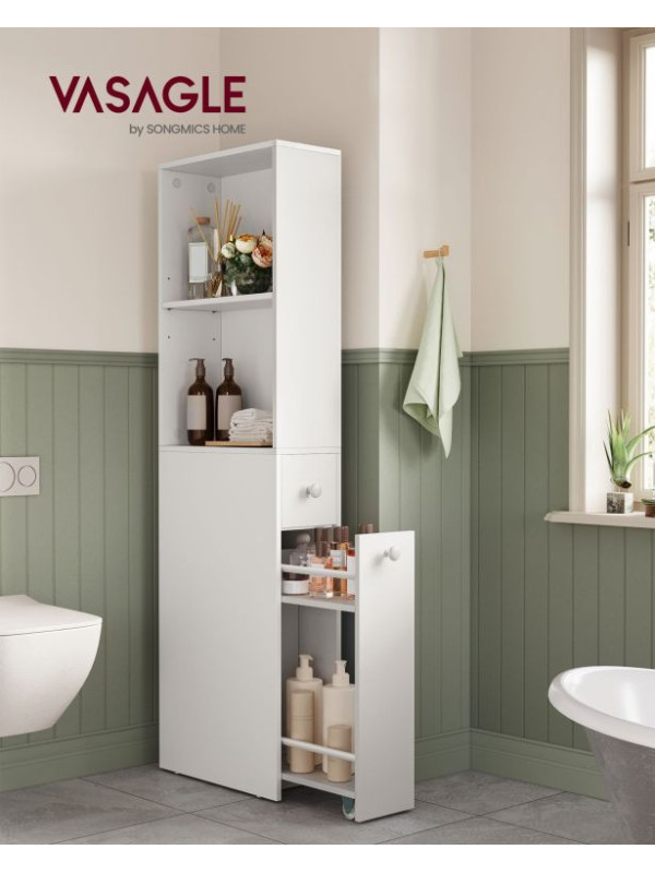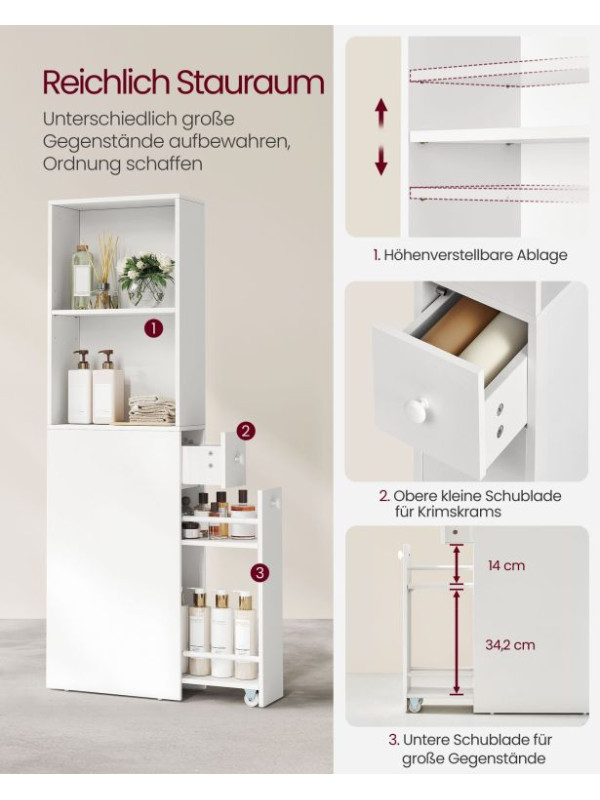 Moderná a funkčná – táto úzka kúpeľňová skrinka v bielej farbe je ideálnou voľbou pre malé kúpeľne a úzke priestory medzi stenou a toaletou. S výškou 134 cm a hĺbkou iba 18 cm ponúka dostatok úložného priestoru, bez toho aby prekážala. Dve otvorené priehradky s nastaviteľnými policami, menšia zásuvka a veľká výsuvná spodná zásuvka pomáhajú udržiavať všetko pekne usporiadané.
