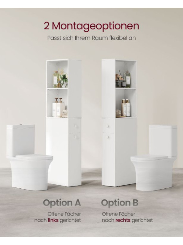 Urobte svoju kúpeľňu útulnejšou a premeňte ju na harmonické miesto, kde má všetko svoje miesto. Skriňa má elegantný, čistý a moderný vzhľad – dokonale doplní každý interiér. Vďaka vysokokvalitnej drevotrieskovej doske je stabilná, pevná a odolná voči vlhkosti. Súčasťou balenia je aj bezpečnostná kotviaca sada, ktorá zabraňuje prevráteniu, takže ju môžete umiestniť vo svojej domácnosti bez obáv, aj keď máte deti.