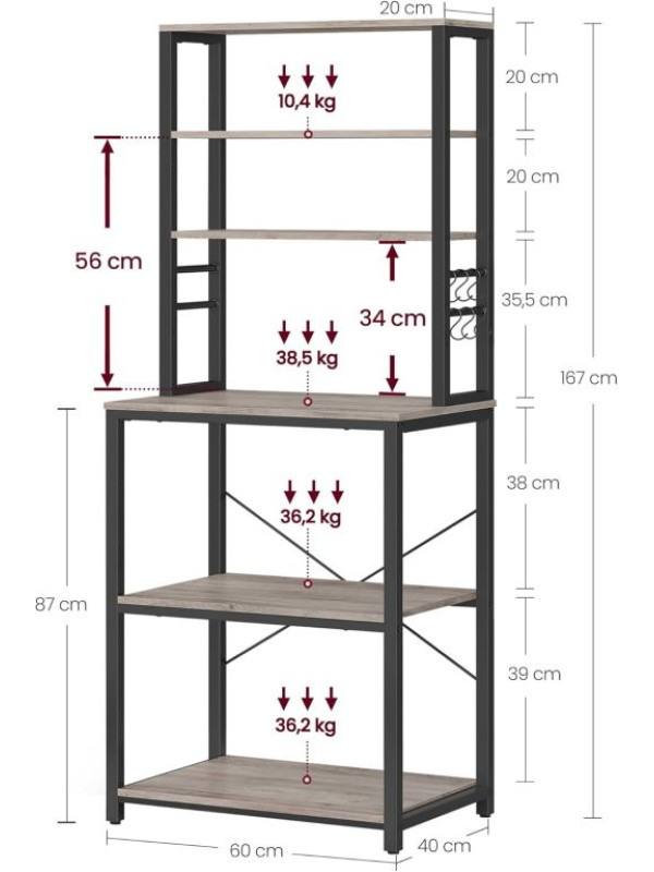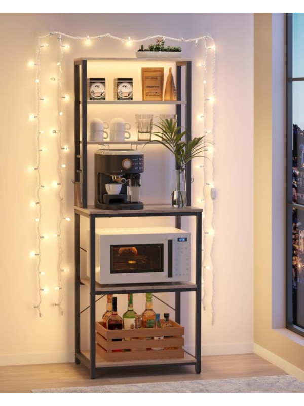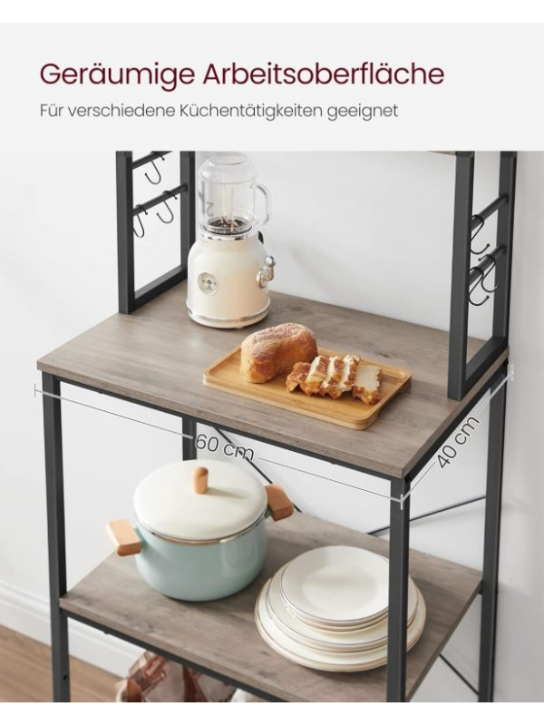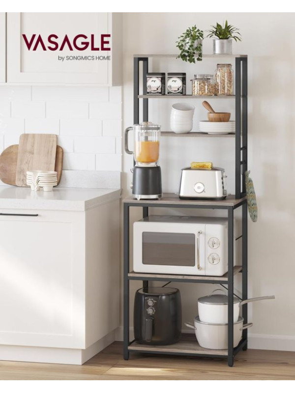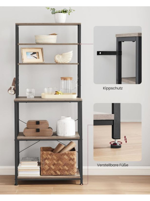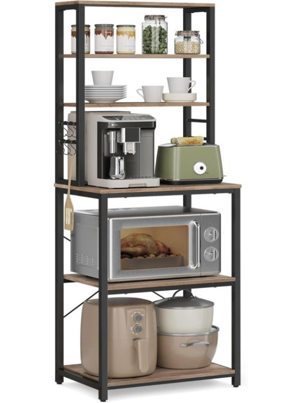 Vneste do svojho domova prehľadnosť a štýl. Tento praktický kuchynský regál s rustikálnym dreveným dekorom a čiernou oceľovou konštrukciou dodá interiéru osobitý industriálny nádych. Šesť políc a šesť háčikov ponúkajú dostatok priestoru pre mikrovlnku, kávovar aj kuchynské potreby. Vďaka univerzálnemu dizajnu sa hodí nielen do kuchyne, ale aj do jedálne, pracovne či obývacieho priestoru.