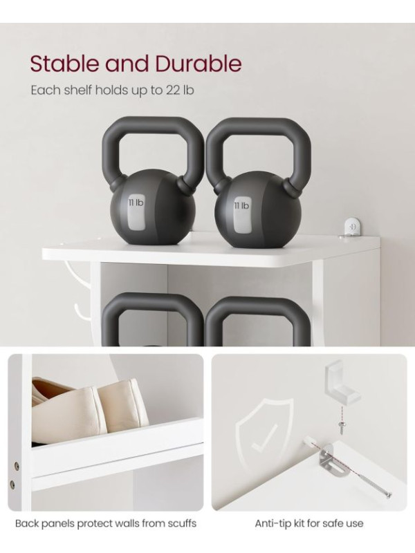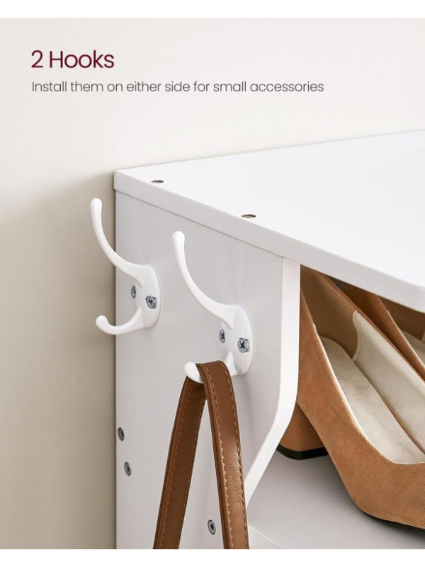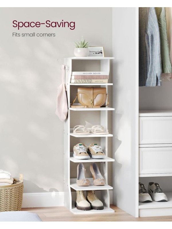 Biela rohová botník s háčikmi, 7 políc, 26,4 x 30 x 110,4 cm