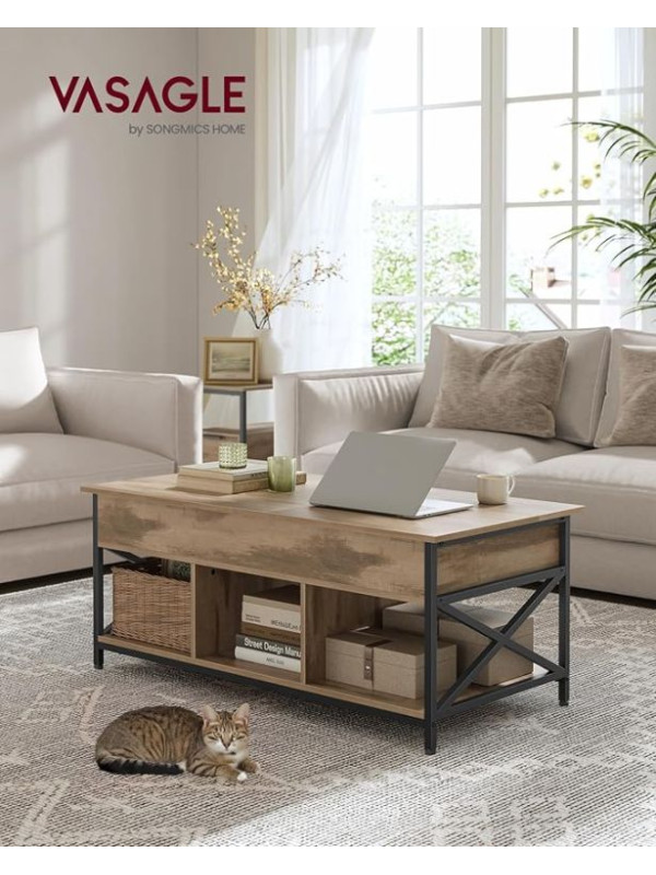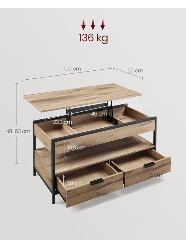 Stolík je vyrobený z odolnej drevotriesky a oceľového rámu, čo zaisťuje dlhú životnosť a stabilitu. Kvalitné kovové pánty umožňujú plynulé zdvíhanie dosky, ktorá unesie až 20 kg. Praktické úložné priestory, vrátane skrytých priehradiek a zásuviek, udržia všetko potrebné po ruke aj skryté pred zrakmi.