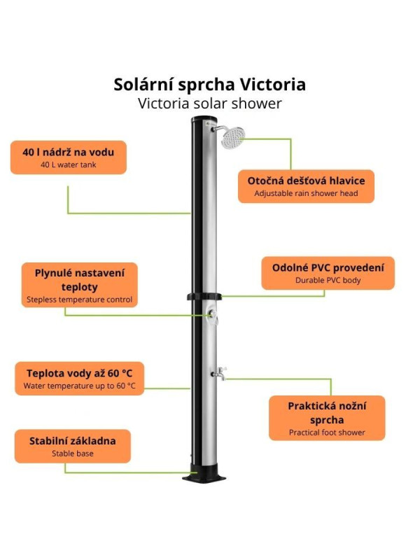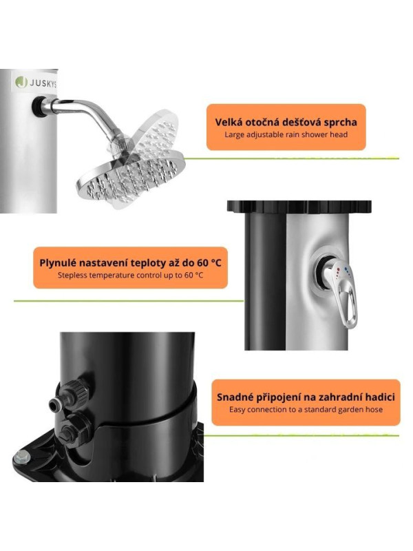 Kvalitné prevedenie z PVC, ABS a kovu zaručuje dlhú životnosť. Jednoduchá inštalácia na kovovú základňu a pripojenie na záhradnú hadicu. 40-litrový zásobník poskytuje dostatok teplej vody na každodenné použitie.